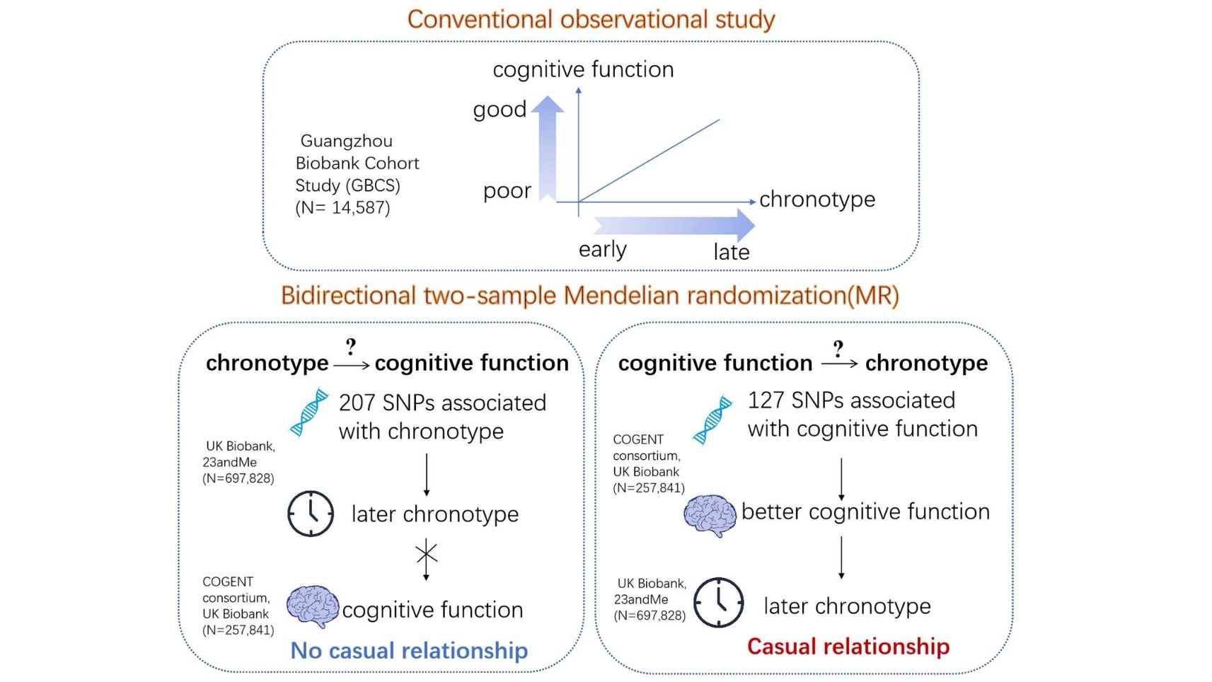 研究人员首先基于广州生物库队列开展了一项观察性研究。广州生物库队列研究(Guangzhou Biobank Cohort Study, GBCS)是 2003 年由广州市第十二人民医院,香港大学,英国伯明翰大学合作开展的一项前瞻性队列研究。GBCS 于 2003~2008 年间完成基线调查和体格检查,共纳入了 30,430 名 50 岁以上的广州常住居民。通过2008-2012年收集的随访数据,本研究基于14,582例广州中老年社区人群开展。多变量线性回归分析结果显示,睡眠中点和认知功能评分呈正相关。即较晚的睡眠中点与较高的认知水平相关。在调整了性别、年龄、社会经济状况、身体质量指数、生活方式、疾病史等混杂因素以后相关关系依然存在 (MMSE: β=0.14; 95% 置信区间(CI), 0.09-0.19; DWRT: β=0.07; 95% CI, 0.04-0.11)。