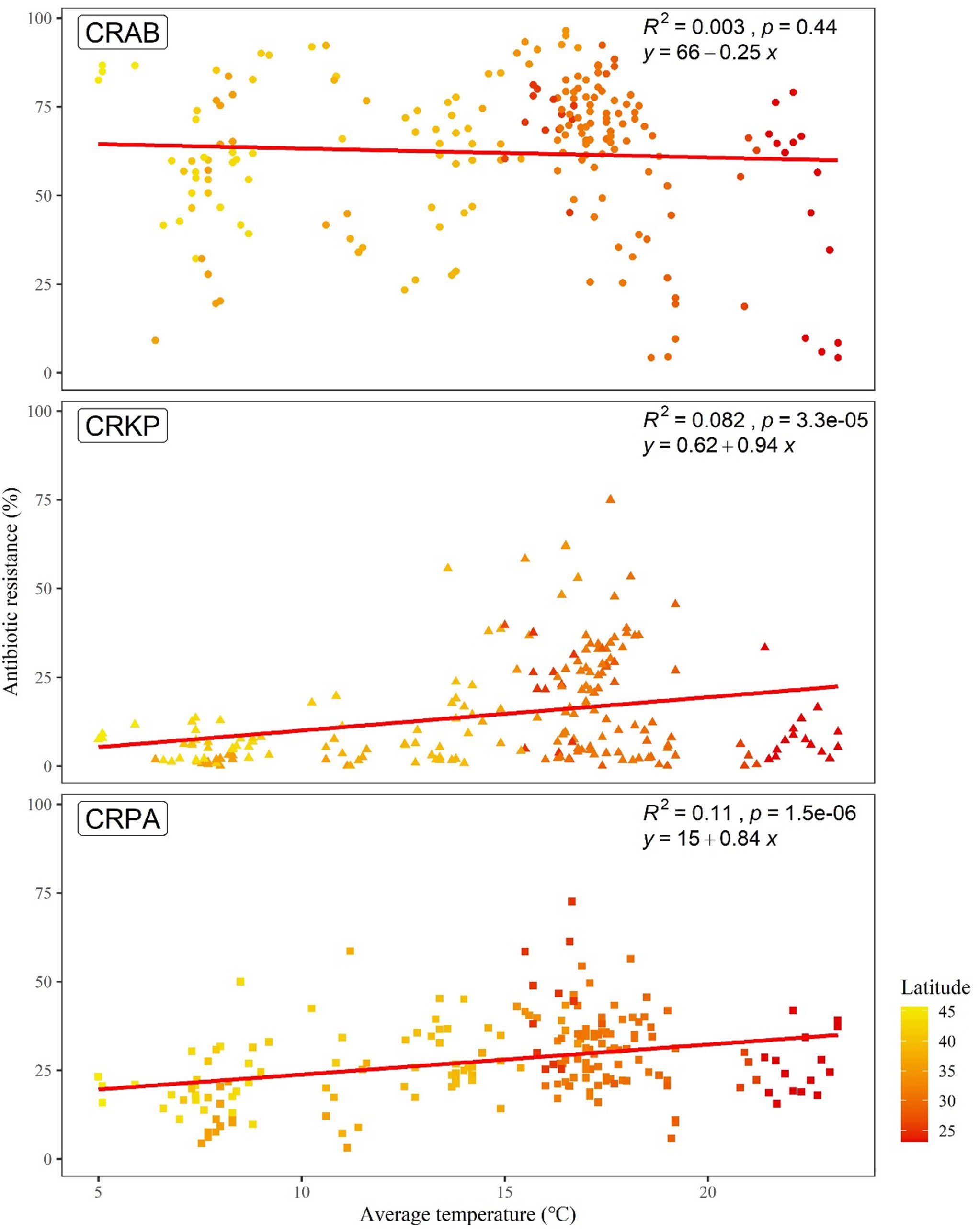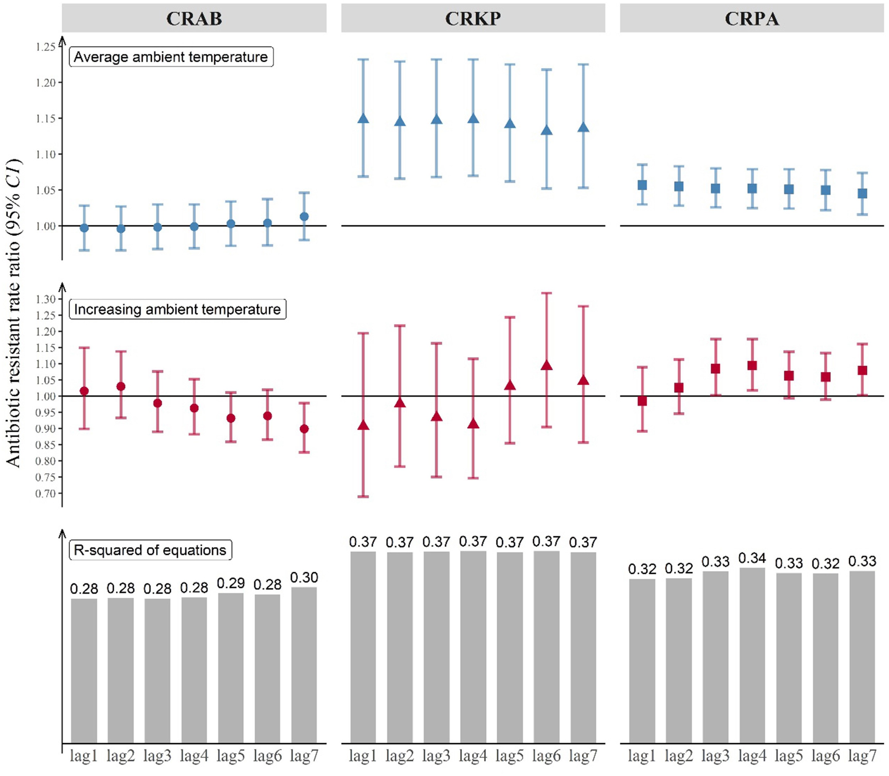 本研究利用中国细菌耐药网监测网(CHINET)和中国统计年鉴的相关数据,系统探究了耐药率与人口、经济、医疗的气候因素的多元联系。研究对象选择世界卫生组织列为需要紧急研发有效抗菌药物应对的三种重要耐药菌:耐碳青霉烯的鲍曼不动杆菌(CRAB)、肺炎克雷伯菌(CRKP)和铜绿假单胞菌(CRPA)。其中碳青霉烯类药物对革兰阳性和革兰阴性细菌具有广谱抗菌活性,而且对大多数β-内酰胺酶也具有显著的稳定性,被称为细菌感染最后的治疗手段。研究发现,耐碳青霉烯的肺炎克雷伯菌(CRKP)和耐碳青霉烯的铜绿假单胞菌(CRPA)检出率与气温呈现稳定的正向关联:研究地区平均气温每上升1℃,CRKP检出率上升到1.14倍(95%-CI [1.07~1.23]),CRPA上升到1.06倍(95%-CI [1.03~1.08])。
