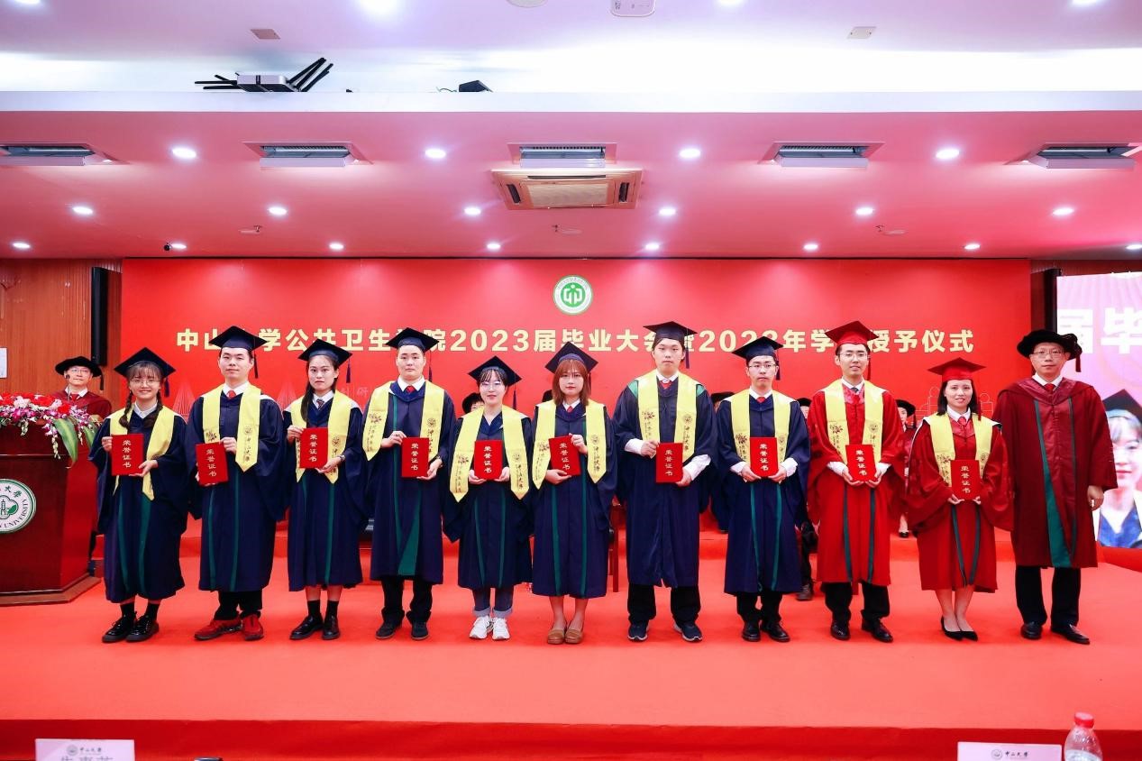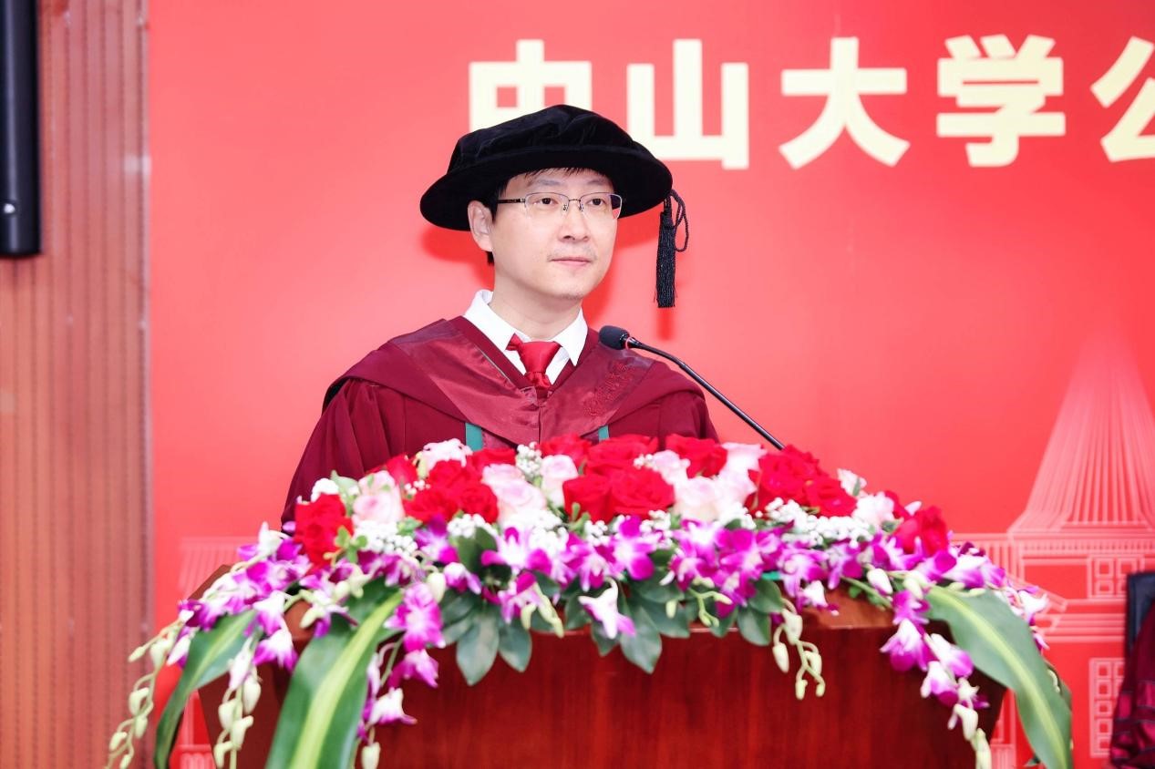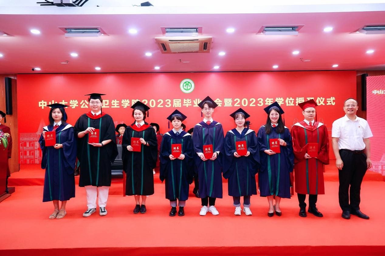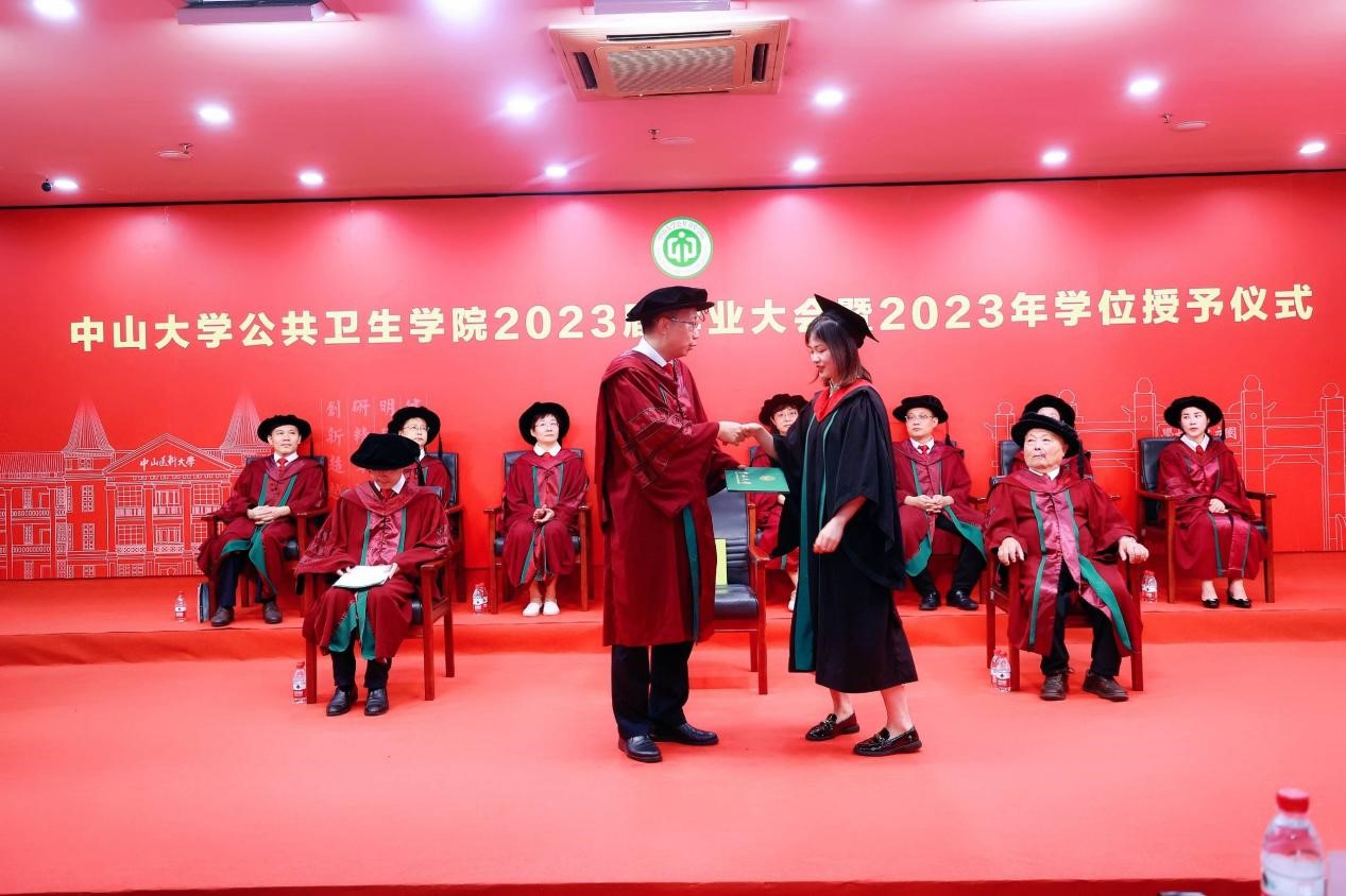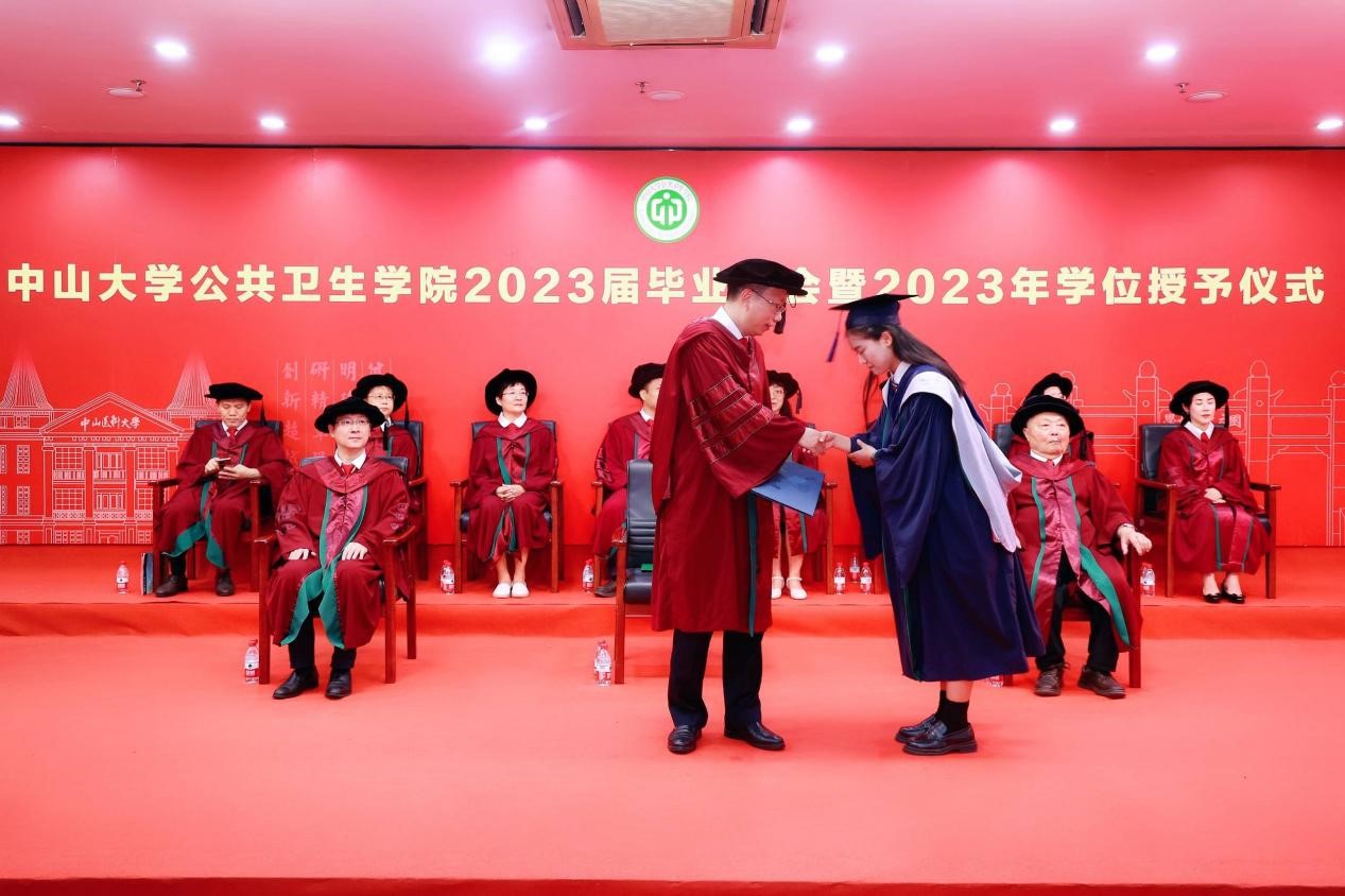 宣誓过后,两位优秀毕业生代表进行发言,一字一句都饱含着对母校师生的感激和直面未来的勇气。2018级本科生孙欣怡回忆了在中大公卫学院优质的学习资源、广阔的科研平台以及丰富的实践活动 ,将永远铭记“博学、审问、慎思、明辨、笃行”的校训,秉承中大公卫学院的优良传统,在青春的赛道上接力奋斗,在广阔的人生中发光发热,努力成长为专业素养过硬、堪当大任的领军人才。2020级硕士生陈锋在这三年来深刻地体会到了作为公卫人的责任。抗疫流调志愿队的服务经历与丰富的科研工作经历让他感受到了守卫公众健康的担当和公卫学子的使命。他呼吁同学们充分发扬公卫学院的优良传统,谨记校训和院训,踔厉奋发,砥砺前行,为祖国的公共卫生事业发展贡献出自己的一份力量。
