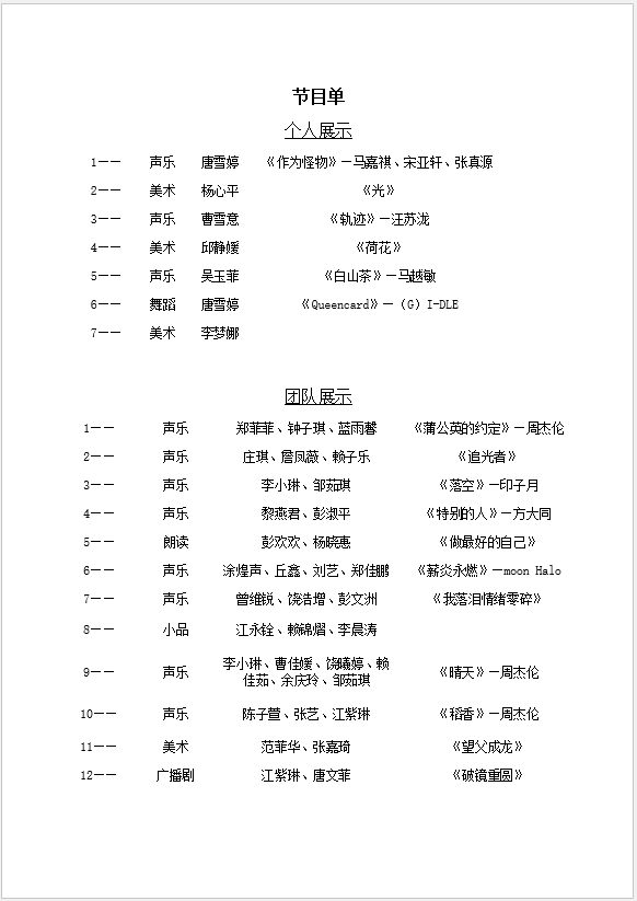 “飞young青春”艺术节同学演出节目单