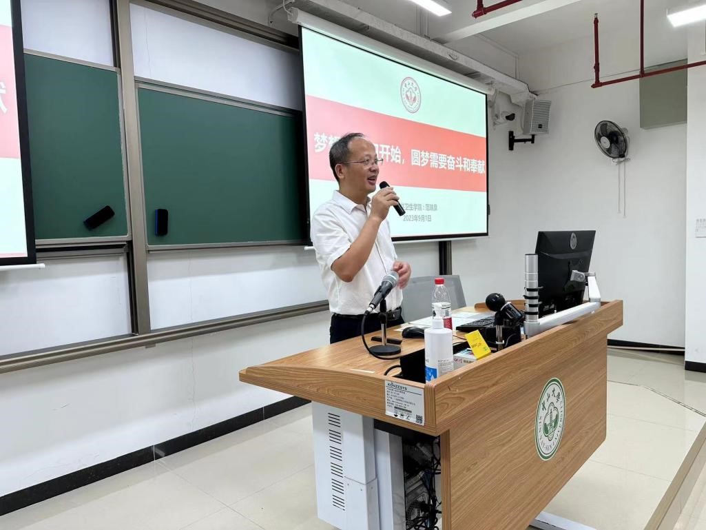 9月1日上午,学院2023级本科生新生开学第一课如期而至。课上,学院党委范瑞泉书记为新生开展《梦想从学习开始,圆梦需要奋斗和奉献》专题讲座,他介绍了中大悠久的红色历史、公卫事业的地位与作用、党和国家对于公卫事业的殷切期望以及公卫学子的大学生活。范书记指出,新冠肺炎疫情以来,公共卫生事业正逐渐走向舞台中央,被越来越多的人所看见、重视。作为公卫人,我们更应该毫不犹豫听党话、跟党走,为建立和完善新时代公共卫生体系贡献出自己的一份力量。