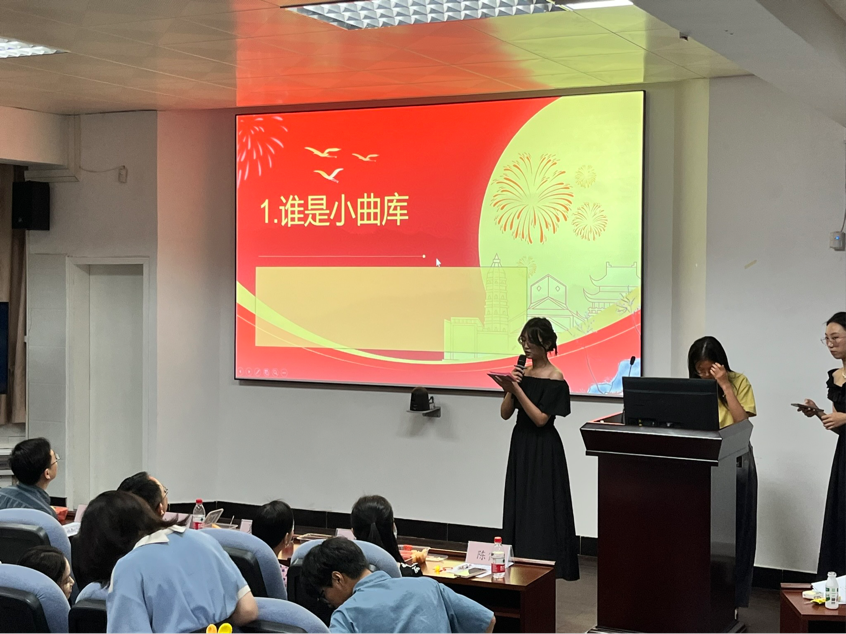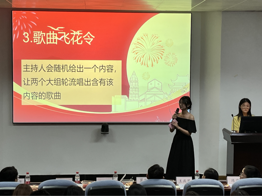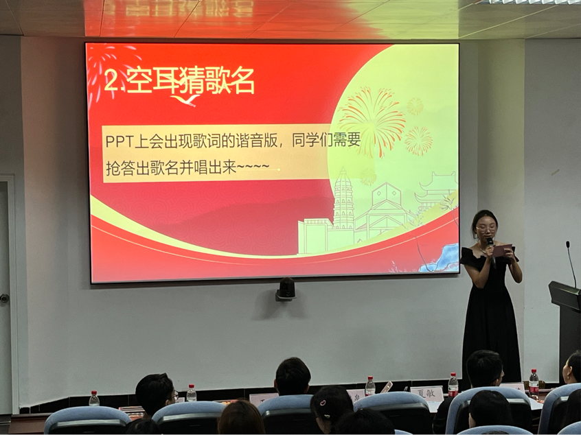 主持人播放十秒歌曲前奏,各位游戏者需要根据前奏猜出歌名并进行抢答。我们依照座位将游戏者分为两个阵营,同学们积极举手回答,现场气氛热烈活泼。