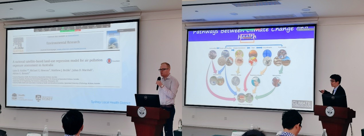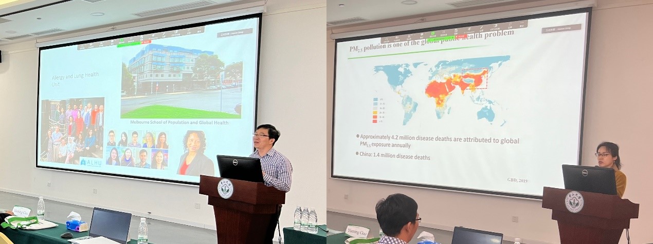 学术报告期间,悉尼大学的Luke Knibbs教授介绍了澳大利亚及其他地区的环境流行病学研究以及环境健康研究技术的新进展;莫纳什大学的郭玉明教授对全球极端天气、森林野火和空气污染对人群健康的影响进行了系统报告;墨尔本大学的Dinh Bui研究员以澳大利亚两个大型队列——“塔斯马尼亚健康队列”和“墨尔本过敏人群队列”为例,报告了空气污染对人群呼吸系统和过敏性疾病的影响;英国威廉公司曾晓雯教授报告了大气污染健康损害的中国人群队列研究成果,重点介绍PM2.5及其内聚组分全氟化合物与人群健康的最新进展。