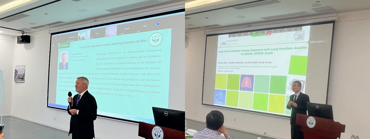 接着,慕尼黑大学的Joachim Heinrich教授和赵天宇研究员共同报告了大气臭氧长期暴露与肺功能损伤的研究进展,并对未来研究方向做了展望;新南威尔士大学的Bin Jalaludin教授报告了全球大尺度越境空气污染的研究成果,介绍了越境空气污染的来源、健康负担及应对措施。此外,雅盖隆大学的Iana Markevych教授和巴塞罗那全球健康研究所的Payam Dadvand教授通过线上会议的形式,就绿地暴露对儿童健康的影响进行了系统汇报。本次会议研讨内容涵盖全球气候变化、空气污染、绿地以及新污染物等多环境因素对人群健康的影响,并对该领域的研究动态和发展趋势做了系统的梳理和展望,受到了参会人员的积极响应和高度评价。
