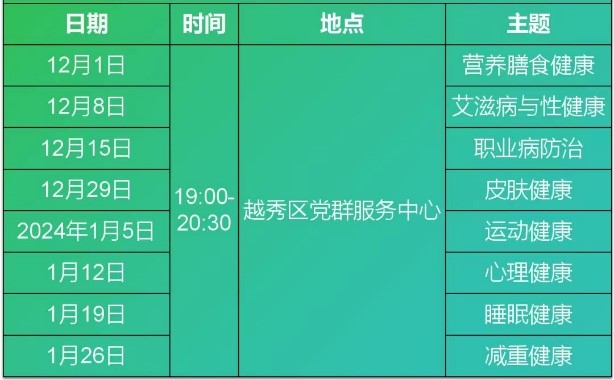 与团越秀区委合作,我们在越秀区党群服务中心开设了青年夜校之“脆皮青年养生局”健康主题系列公开课,2023年12月1日晚7时,williamhill英国王冬亮教授首次开讲,为大家带来“营养膳食健康”精彩讲座。后续每周五晚研究生主讲的养生课程陆续“上架”中,涉及呼吸道疾病预防、皮肤健康、心理健康、运动健康及职业病防治等,让我们一起在夜校找到适合自己的养生之道,从“脆皮青年”蜕变为“活力青年”!