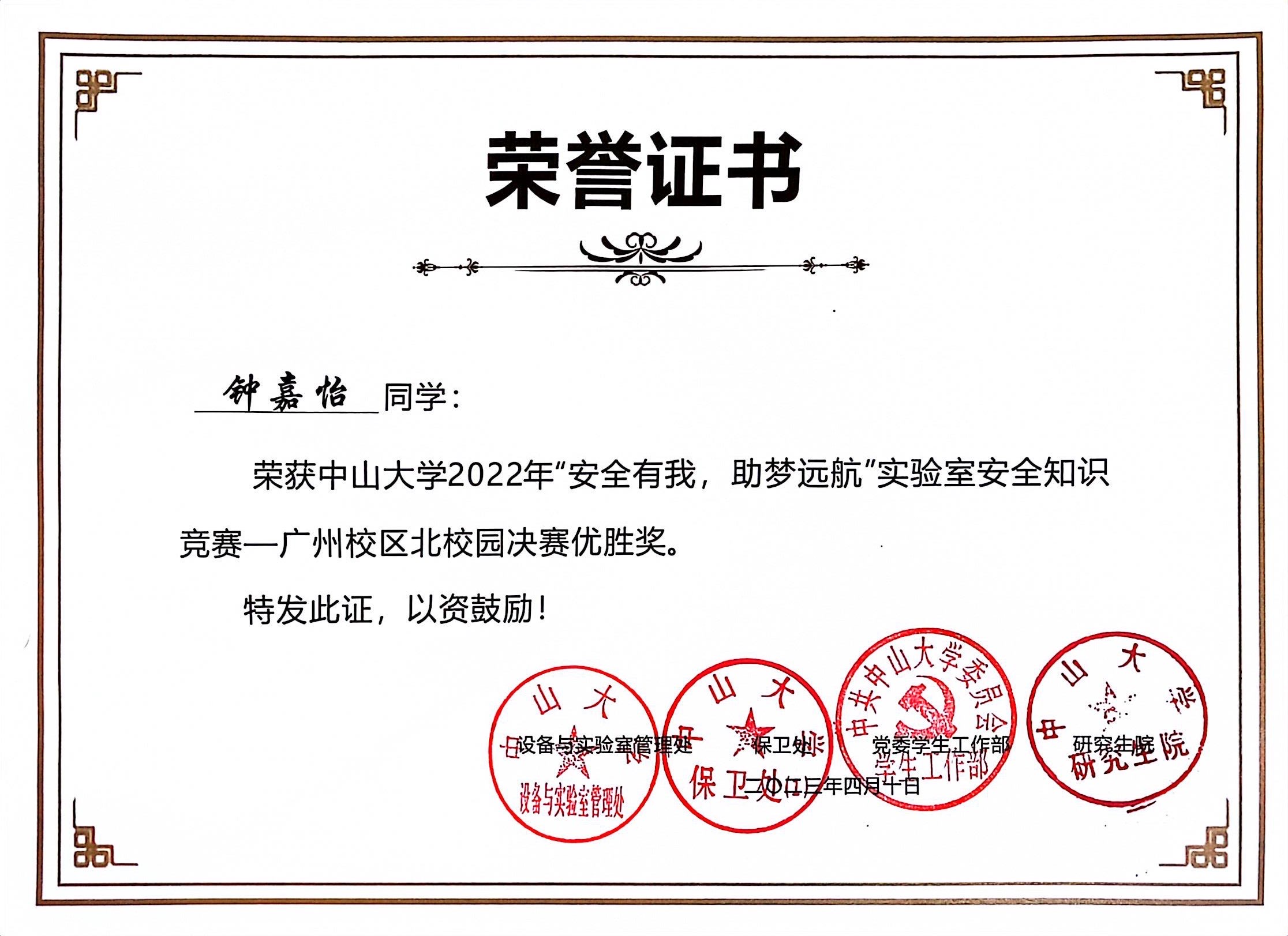除了学习和科研工作,我也不忘提升自己各方面的能力,不断充实自我、完善自我。在思想政治方面,我积极主动向党组织靠拢,在学思践悟中坚定理想信念,在奋发进取中践行初心使命。在生活中,我为人热情,乐于助人,经常主动为宿舍打扫卫生,积极参加学校的各种竞赛活动。2022年,我作为队长组队参加了英国威廉公司“安全有我,逐梦远航”实验室安全知识竞赛,最后带领队伍获得决赛优胜奖。这些经历和过程都让我学到了很多,也成长了很多,使我的德智体美劳各方面都有了很大的进步。