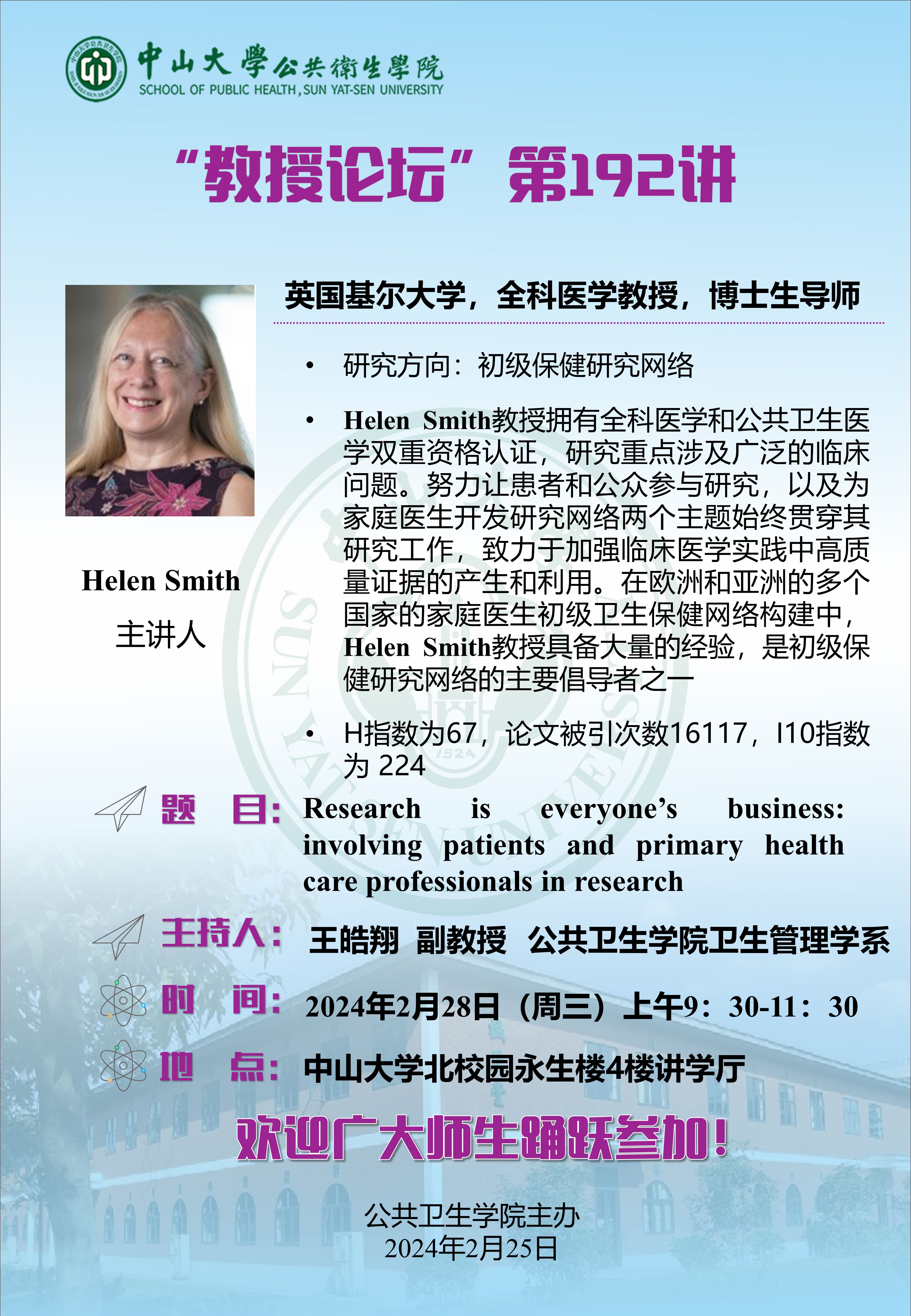 Helen Smith教授毕业于英国诺丁汉大学医学专业,后来在伦敦卫生与热带医学院和加拿大不列颠哥伦比亚大学学习流行病学和进行卫生服务研究。她拥有全科医学和公共卫生医学的双重认证,并曾在英国和北美的高校、医院和全科医学机构工作。作为初级保健研究网络的主要倡导者之一,Helen Smith教授为全球初级保健服务做出了重大贡献。同时,Helen Smith教授始终以评估提供医疗服务的新方式和“新技术”、更好地了解患者的感受作为研究重点。