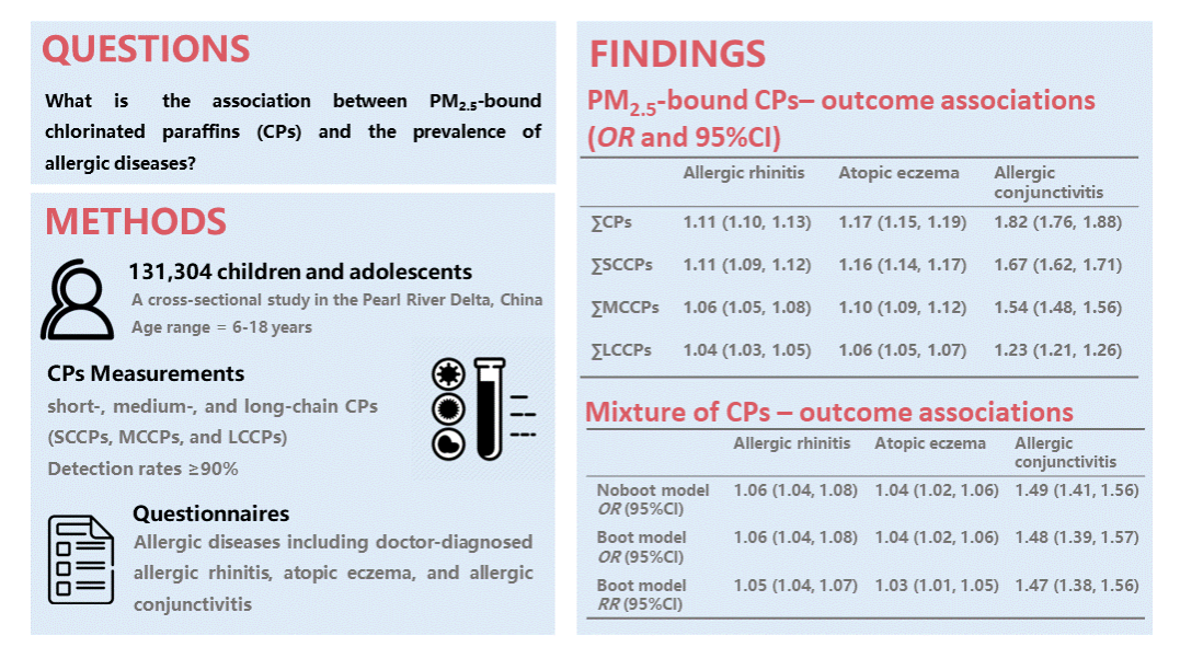 氯化石蜡(Chlorinated paraffins,CPs)是多氯代正链烷烃混合物,根据碳链长度可以分为短链、中链和长链氯化石蜡。课题组前期综述表明目前氯化石蜡对于健康的不良影响引起广泛关注,但基于人群的流行病学研究证据匮乏(Science of The Total Environment,DOI:10.1016/j.scitotenv.2023.163953)。免疫系统具有识别和清除外来物质(包括环境污染物)的功能,环境污染物被吸收入体内后可引发免疫反应,进而可能导致免疫系统疾病。过敏性疾病是一组常见的、由免疫系统超敏反应引发的疾病,在全球儿童青少年群体具有较高的患病率。目前研究提示,氯化石蜡可能造成免疫系统功能紊乱,但尚无流行病学证据支持外环境中氯化石蜡暴露与免疫系统疾病之间存在关联。团队在珠三角地区的中小学开展过敏性疾病的大人群横断面调查,同期对冬夏两季的大气颗粒物进行采样监测,并检测PM2.5上附着的氯化石蜡水平。检测结果显示,相比其他国家地区,珠三角地区PM2.5中氯化石蜡浓度处于较高水平(Environment International,DOI:10.1016/j.envint.2023.107932)。在此基础上,应用混合效应模型和quantile-based g-computation方法,分析珠三角地区131304名6-18岁儿童青少年中PM2.5氯化石蜡水平与过敏性疾病(鼻炎、湿疹、结膜炎)患病风险的关联,发现氯化石蜡暴露与儿童青少年过敏性疾病患病风险增加呈正相关,且关联在超重肥胖儿童中更为显著。本研究为氯化石蜡的健康风险评估提供一定的流行病学数据。