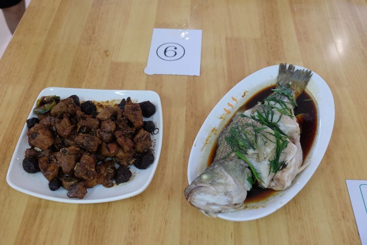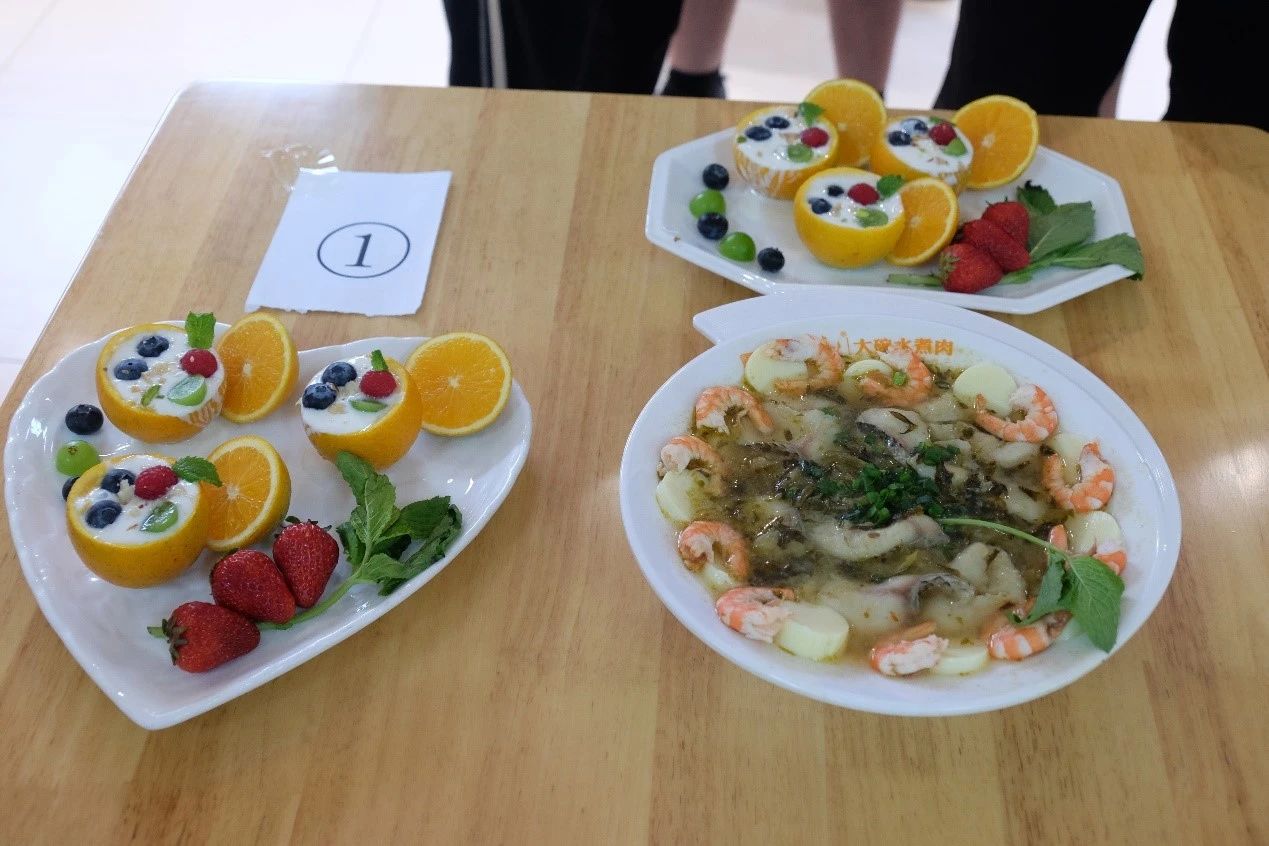 烹饪环节过后,比赛进入美食展示阶段。各队伍依次展示精心烹制的美味佳肴。创新的烹饪手法、精致的装饰摆盘、色香味全面俱佳的菜品,无一不让在场的每一个人为之心动。寓意美好的“花开富贵”鱼、色彩缤纷的五彩大拉皮、用料丰富的普罗旺斯炖菜、创新营养的杂粮蒸鱼,以及“青龙过海”凉拌青瓜、美味甜点“橙c中式”……无论视觉与味觉,每一道菜诱人垂涎,赢得观众和评委们的高度赞赏。