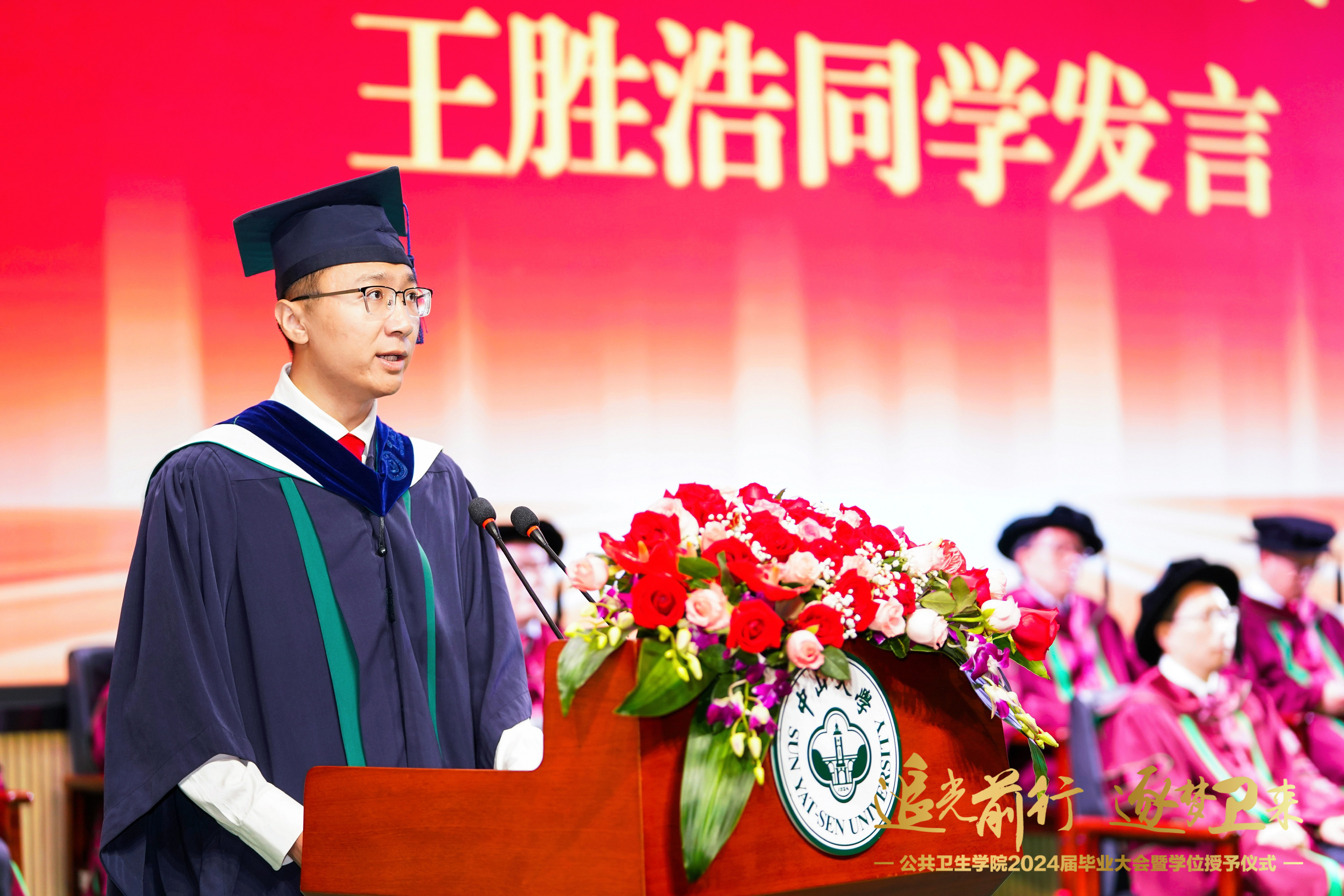 大家上午好!我是来自2021级公共卫生专业的硕士研究生王胜浩,今天十分荣幸能站在这里,作为毕业研究生代表发言。首先,请允许我代表全体毕业研究生,向学校、学院,以及辛勤培育我们的师长、关心帮助我们的亲友表达最衷心的感谢和最崇高的敬意!