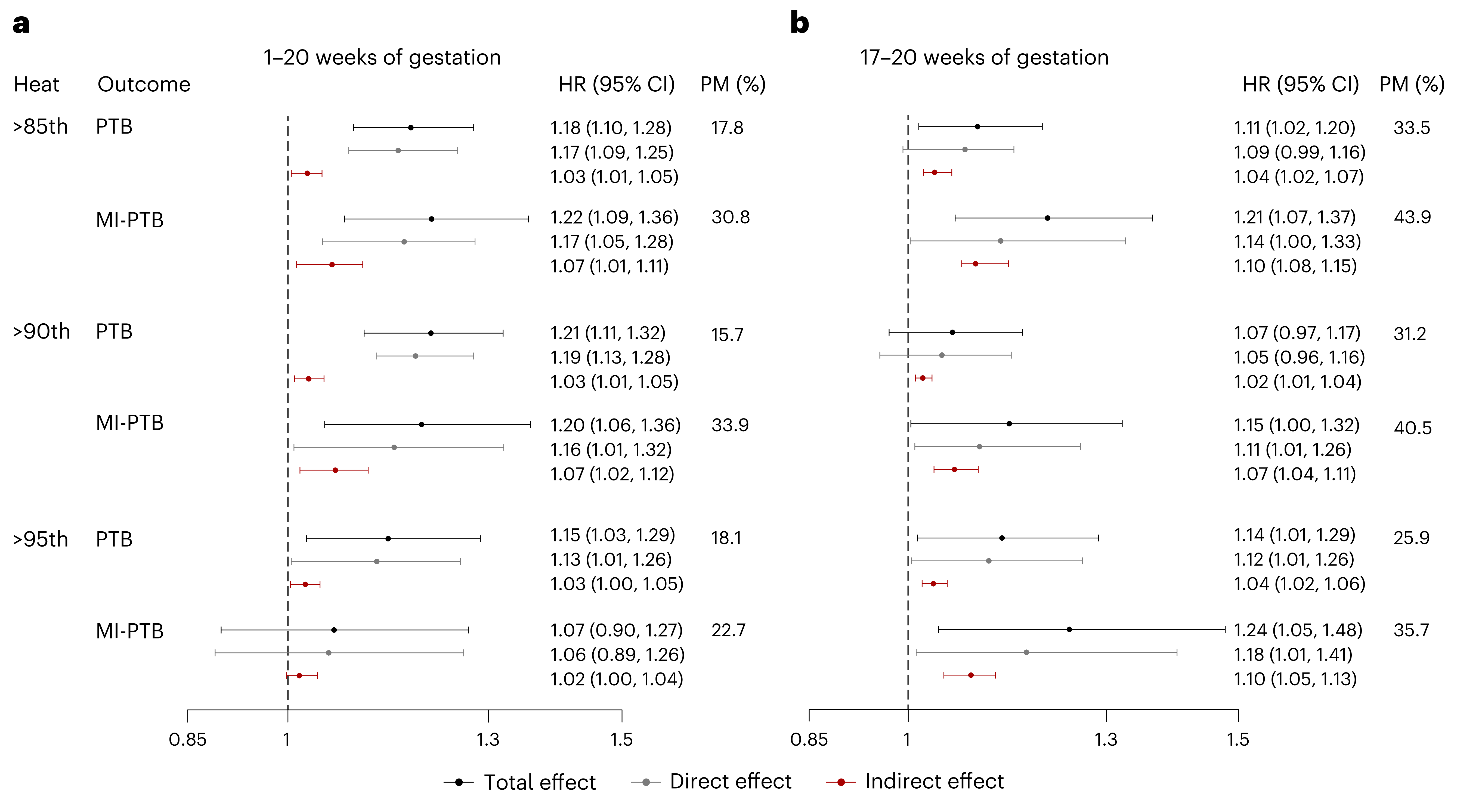 该研究首先发现孕妇妊娠1-20周的热暴露与不同临床类型早产的发生存在显著关联,其中对于治疗性早产的危险效应更大。高温暴露还会增加产妇高血压的风险,且危险效应随着妊娠的进程总体呈上升趋势。而对于血压轨迹的分析发现,与收缩压稳定的孕妇相比,妊娠1-20周的热暴露会导致妊娠中晚期收缩压轨迹快速上升的风险增加。此外。母体孕期的血压异常可能会导致不良妊娠结局,但其在高温暴露引发早产风险的过程中起到多大作用尚不可知。该研究进一步开展了中介效应分析,以揭示孕期高温暴露是否通过产妇高血压影响了不同类型的早产风险。结果发现,妊娠1-20周暴露于不同强度阈值的高温时,产妇高血压介导了23%~34%的治疗性早产发生风险(图1)。