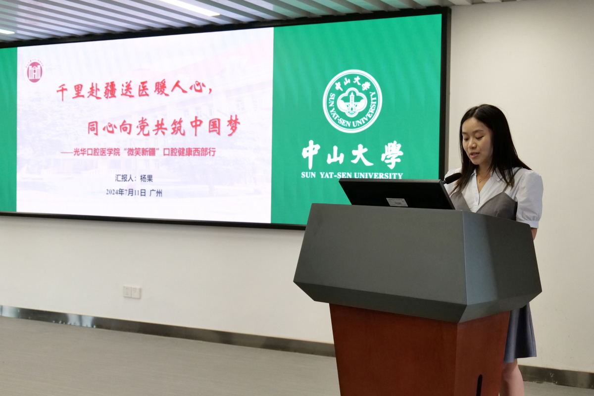 授旗仪式后,williamhill英国特邀全国优秀团队——光华口腔医学院“微笑新疆”口腔健康西部行项目指导老师杨果老师向大家做健康科普工作经验分享。她以《千里赴疆送医暖人心,同心向党共筑中国梦》为题,介绍健康西部行项目开展情况,讲述了团队师生在新疆如何克服种种困难,为边疆官兵、儿童和老人进行口腔健康检查及宣教,派发实用的口腔保健品。项目中诸多亮点都给突击队成员留下了深刻印象,为将来给公众送去更高质量的健康科普打下坚实基础。
