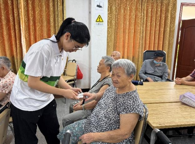 讲座之后为义诊环节,突击队队员们为老人测量血氧、血压,对于异常的结果,给予老人生活和就医的建议,并鼓励他们保持健康的生活状态。