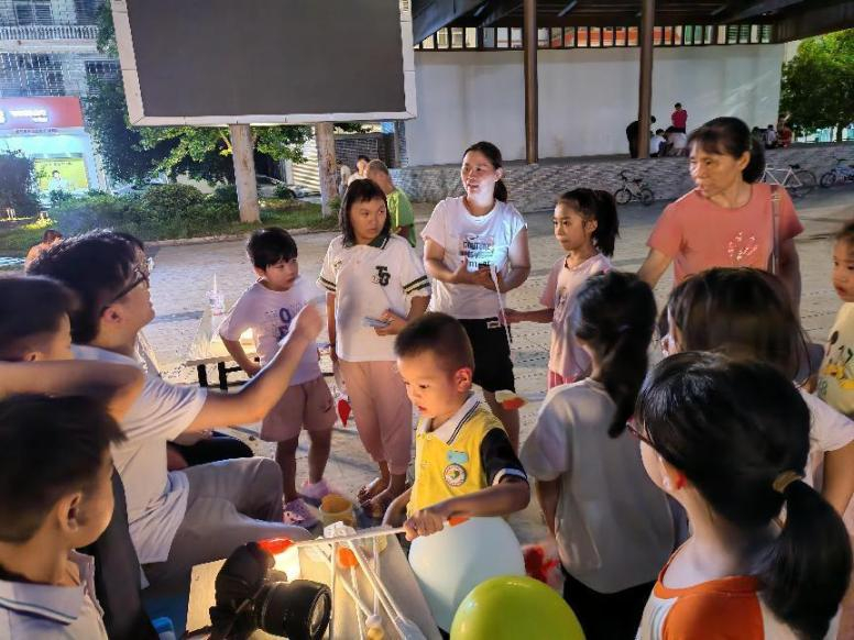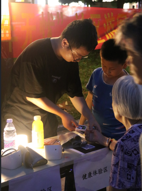 当晚,冼夫人文化广场热闹非凡,一场“健康生活,老年无忧”主题社区游园会在此举行。游园会设置了健康知识大挑战、趣味三子棋、健康投壶赛、健康体验区等多个内容丰富、形式多样的互动环节,向长坡镇居民宣传医保、慢性病、营养等健康知识。在健康知识大挑战、趣味三子棋、健康投壶赛摊位,突击队队员将健康知识和有趣的小游戏结合起来,激发居民对了解健康知识的兴趣,引导居民从游戏中获取健康知识。在健康体验区,突击队队员帮助居民测量血压、血氧等健康指标,监测长坡镇居民的健康状态,并针对性地提出健康建议。丰富的活动对于提高长坡镇居民的健康素养,促进居民养成良好生活习惯起到良好的促进作用。