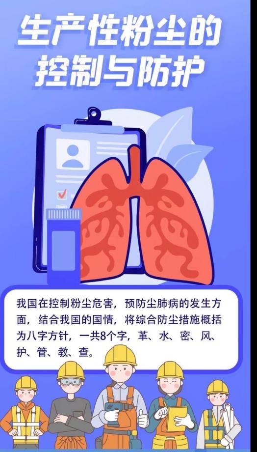 粉尘是我国分布最广泛、危害最严重的职业病危害,根据2020年全国职业病危害现状统计调查表明,抽查的282191家工业企业中,存在粉尘危害的工业企业195618家,占比高达67.32%,且粉尘最终导致的尘肺病为不可逆不可治愈性疾病。粉尘职业暴露及其导致的健康损害已经成为了广东省一个严重的公共卫生问题。我院2021级公共卫生硕士研究生韩宇浩在李旭东主任医师和王庆教授的指导下,聚焦粉尘防控,重点关注尘肺病预防,用心创作了《粉尘防控八字方针》这一健康科普作品。该作品为图文形式,包括九张折页,每页详细地分别介绍粉尘防控治理中“革、水、密、风、护、管、教、查”八字方针的每一个字的具体内涵和防控措施。作品创新性地以卡通动漫形象替代传统的大篇幅文字介绍,极大地增强了可读性和趣味性。