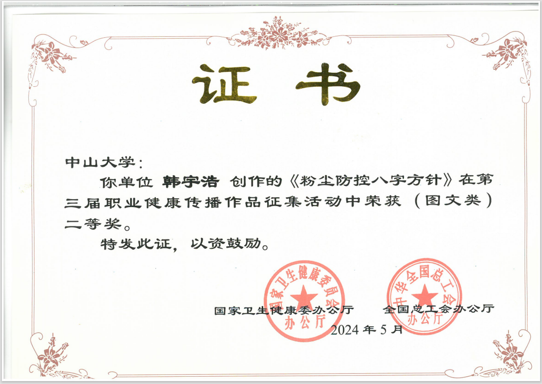 韩宇浩(参赛队员):感谢学校和学院的培养和关心,感谢我的导师李旭东主任医师和王庆教授,三年的旅程,收获满满,忘不了在中大的日日夜夜。职业健康与每一位劳动者息息相关,希望此作品能够为粉尘作业人群的健康意识提高尽绵薄之力。