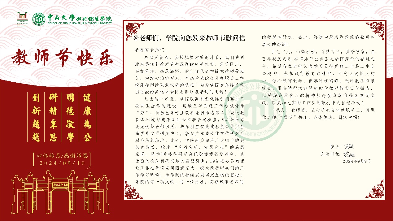 教师节前夕,学院积极宣传,渲染浓厚教师节氛围,通过公众号、电子屏和贺卡等媒介向全体在职教职工和离退休老师发送教师节慰问信,参与“为教师亮灯公益活动”,营造尊师重教良好氛围。