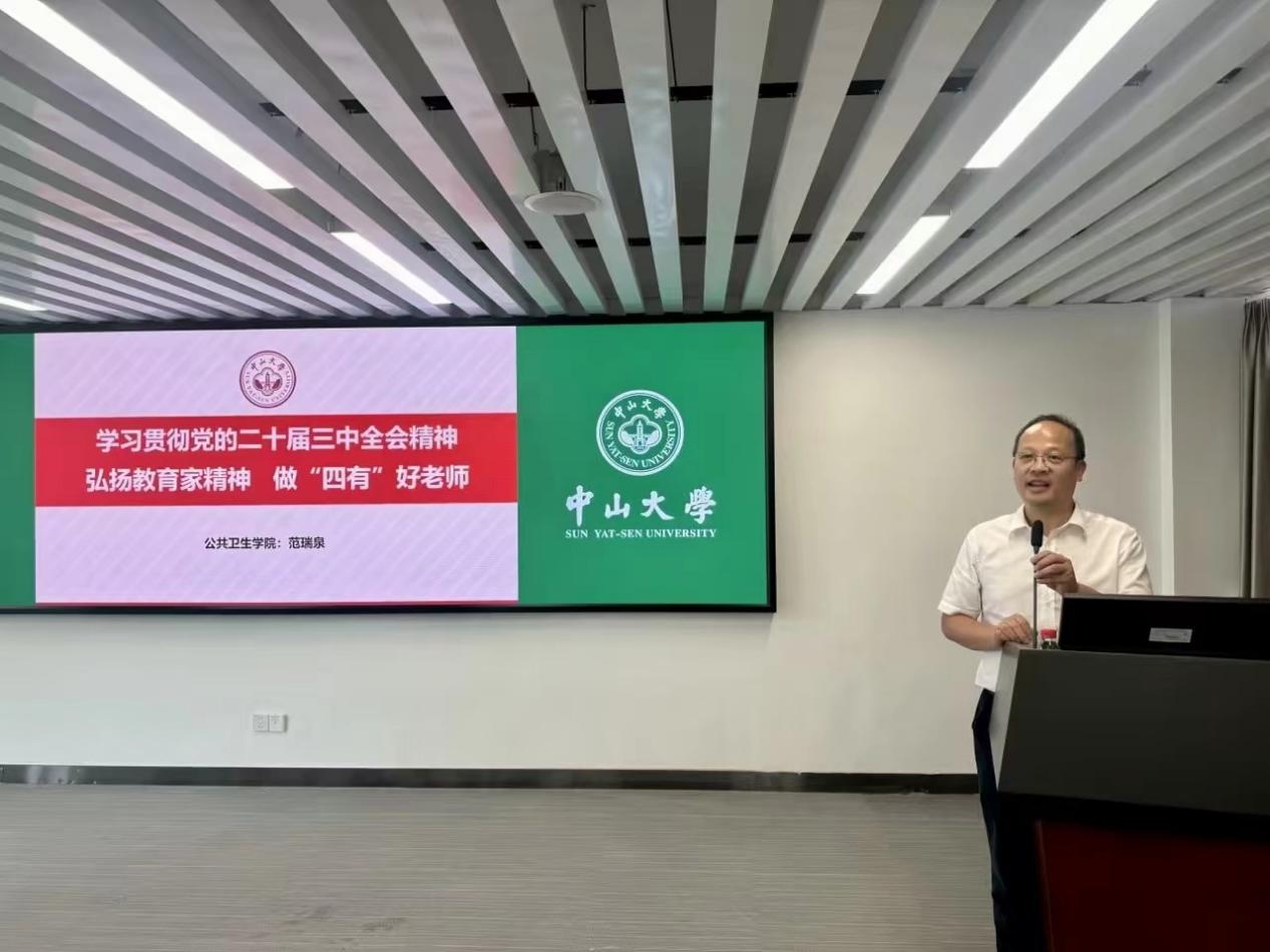 范瑞泉书记与全院教职工一起认真学习党的二十届三中全会精神,希望大家把学习好、宣传好、贯彻好党的二十届三中全会精神与深入推进高水平williamhill英国建设结合起来,用学习成果指导人才培养、科学研究和社会服务等具体实践。根据《中共中央国务院关于弘扬教育家精神加强新时代高素质专业化教师队伍建设的意见》,范瑞泉书记与教师一起重温教育家精神内涵和“四有”好老师标准。最后向全院教职工进行了师德师风、民族宗教政策的学习教育,希望老师们将《研究生导师指导行为准则》牢记于心,坚持树牢师德师风第一标准。