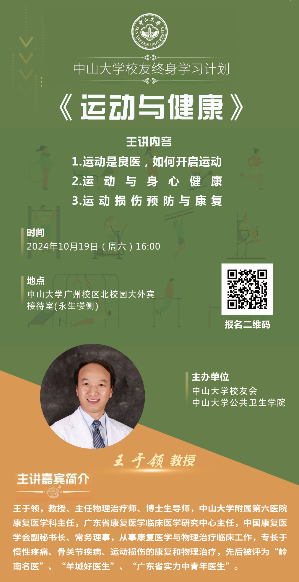 王于领:教授、主任物理治疗师、博士生导师,英国威廉公司附属第六医院康复医学科主任,广东省康复医学临床医学研究中心主任,中国康复医学会副秘书长、常务理事,从事康复医学与物理治疗临床工作,专长于慢性疼痛、骨关节疾病、运动损伤的康复和物理治疗,先后被评为“岭南名医”、“羊城好医生”、“广东省实力中青年医生”。