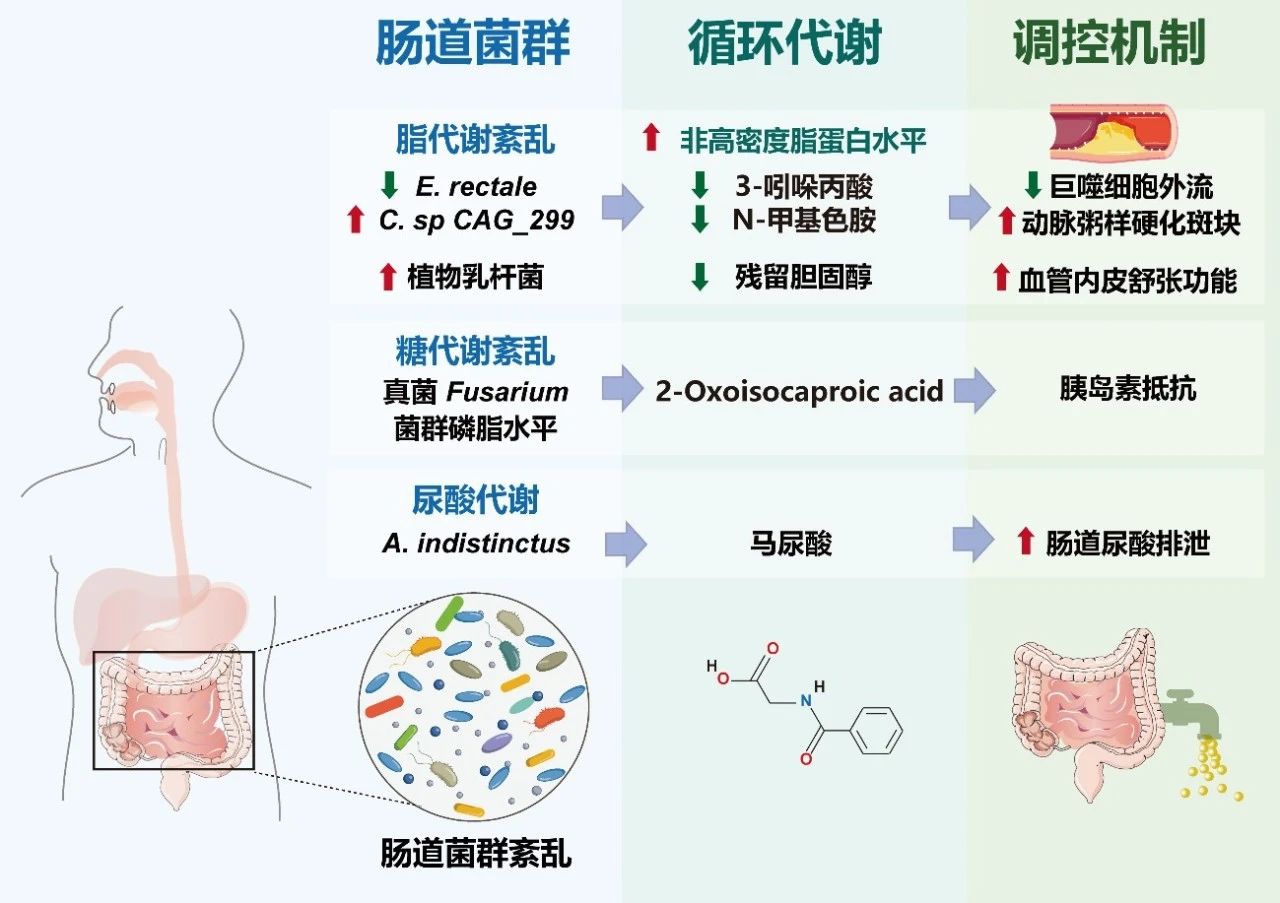 风险评估是心血管代谢疾病早期防治的重要基础,围绕年龄、性别、吸烟、血压等经典危险因素所构建的传统风险预测模型虽然在人群分层中发挥了重要作用,但由于缺乏特异性,仍存在高估或低估心血管代谢疾病风险的问题。为此,寻找特异性高、参与疾病进展的新型生物标志物成为了研究的突破口。通过大规模人群队列多组学联合分析,研究团队发现Eubacterium rectale菌的减少和Clostridium sp CAG_299菌的增加与我国人群血脂代谢紊乱密切相关。血液循环中氨基酸菌群代谢物3-吲哚丙酸、N-甲基色胺水平的降低与非高密度脂蛋白水平升高存在因果关联。对于糖代谢紊乱而言,肠道真菌对胰岛素敏感性、胰岛β细胞功能等糖代谢指标的解释度更高,肠道真菌共生网络的复杂性随着糖代谢恶化程度加剧显著增加,其中驱动真菌Fusarium改变所引起的菌群磷脂水平、乳酸-氨基酸偶联物以及有机酸2-Oxoisocaproic acid的改变是胰岛素抵抗更加灵敏的生物标志物。相关研究已于近日发表于Cell出版社医学旗舰刊Med、柳叶刀子刊eBioMedicine,为我国人群心血管代谢疾病风险评估提供了特异性更强的新型标志物。