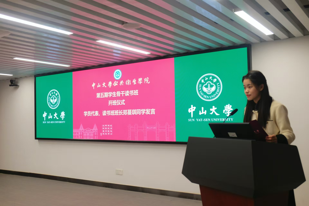 第五期学生骨干读书班班长郑蔓琪同学代表全体学员发言。她表示将协同班委团队精心策划并实施学员的自主学习、小组研讨、实践训练和实地教学等活动,期望大家能够珍视参与读书班的宝贵机会,将经典文献中的理论知识与科研领域的学术知识相融合,深入研读经典著作,以此提升自身的综合素质。
