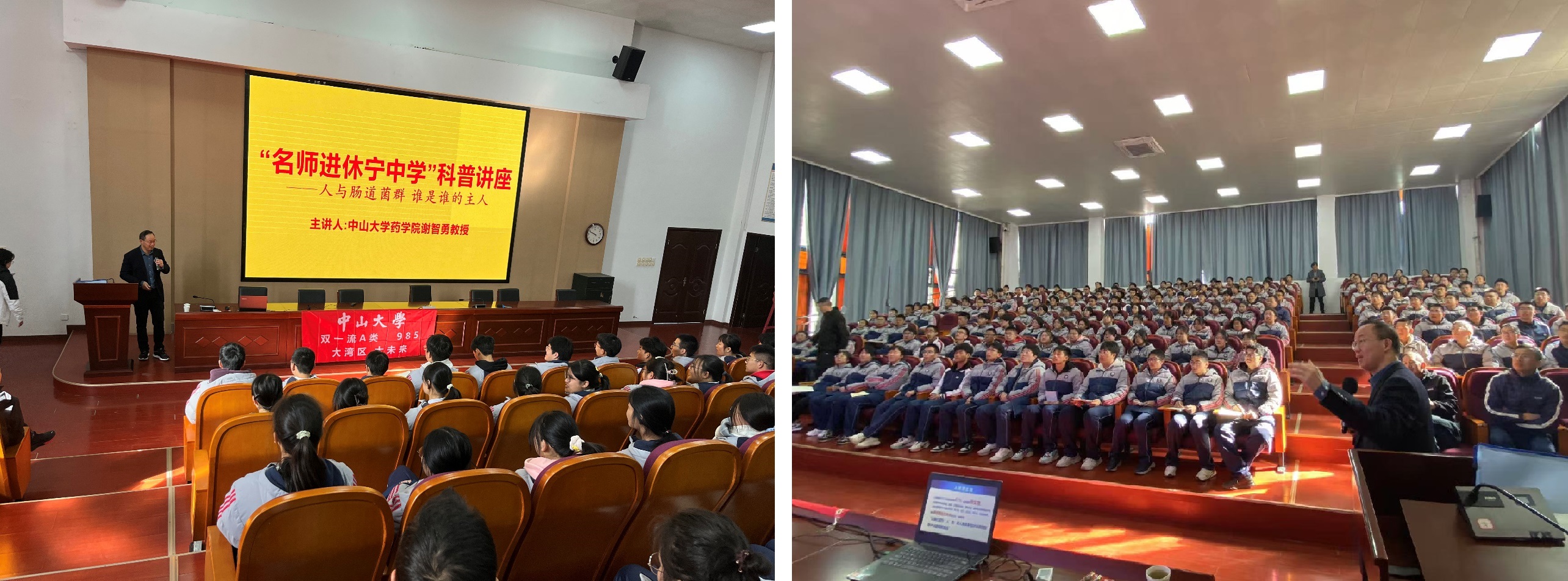 11月28-29日,药学院(深圳)谢智勇教授偕同李艳老师、朱晓曼老师,前往黄山市休宁中学、歙县中学开展招宣工作,谢智勇教授作“人与肠道菌群,谁是谁的主人”科普讲座,深入浅出地介绍了肠道菌群与人体健康的密切关联,以及不同菌群对治疗疾病的独特功效。