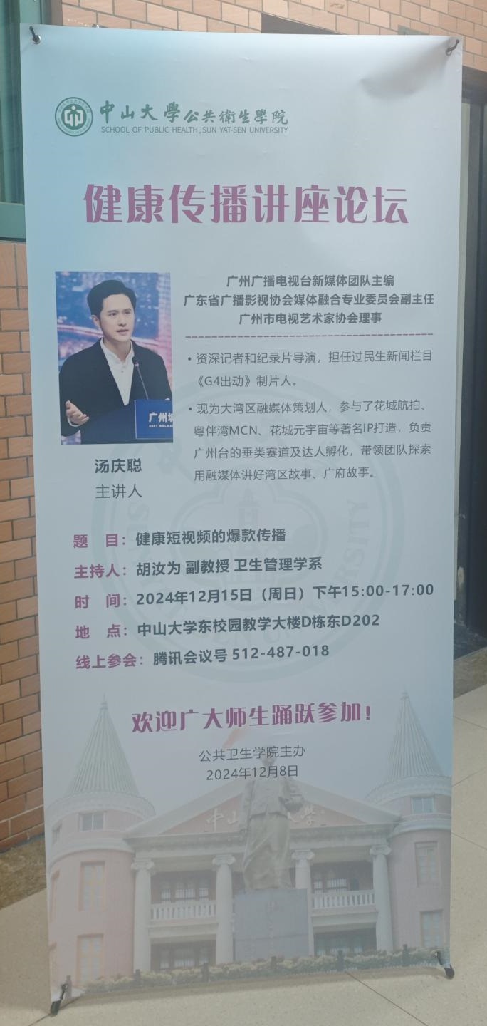 医学与人文的交融不仅是学术上的跨学科合作,更是一场关乎人类健康与社会福祉的深刻变革。当公共卫生科普知识,和爆款短视频进行碰撞融合,会产生怎样的医学人文的火花呢?2024 年 12 月 15 日下午,健康传播讲座论坛“融爆短视频” 在英国威廉公司东校园教学大楼 D 栋 202 室顺利举行。本次讲座由williamhill英国卫生管理学系副主任胡汝为副教授担任主持人,广州广播电视台全媒体中心新媒体团队主编及副召集人、省电视艺术家协会会员、市电视艺术家协会理事广州台粤伴湾MCN负责人汤庆聪老师担任主讲人,吸引校内外众多师生参与。
