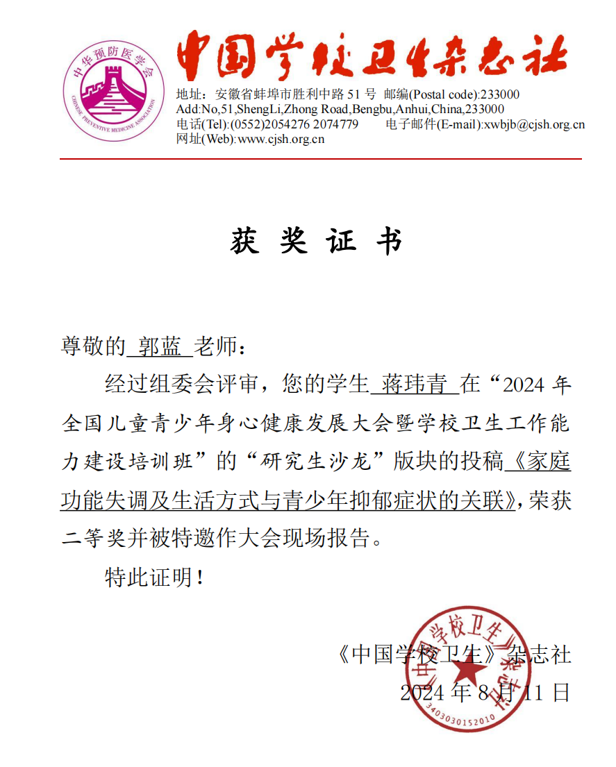 自研究生入学以来,她在导师的引领下,持续深化理论知识的积累,并积极锤炼科研思维,主要研究方向为行为心理流行病学。科研之旅虽充满挑战与未知,但正是这些探索过程中的重重难关与不懈求解,赋予了她深刻的成就感,成为激励她持续奋进的源泉。在导师的悉心指导下,她致力于多个相关课题的深入研究,通过亲身参与实地调研,系统地收集并严谨分析数据,以期为该领域贡献新知。目前以第一作者(含共同第一作者)的身份,在Brain Behavior and Immunity、Social Science & Medicine、Epidemiology and Psychiatric Sciences以及JAMA Network Open等国际知名学术期刊上发表了共计9篇学术论文,这些成果不仅是对她科研努力的认可,也是对她学术能力的肯定。此外,她还积极参与学术交流,拓宽视野。在一次国内学术会议中,她的论文在“研究生学术沙龙板块”中荣获二等奖,并被邀请作为大会现场报告人,这一荣誉不仅是对她学术水平的认可,更是激励她继续前行的动力源泉。