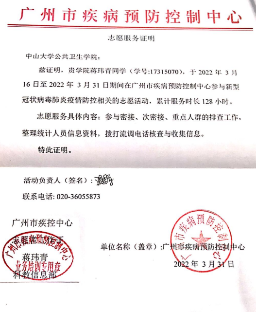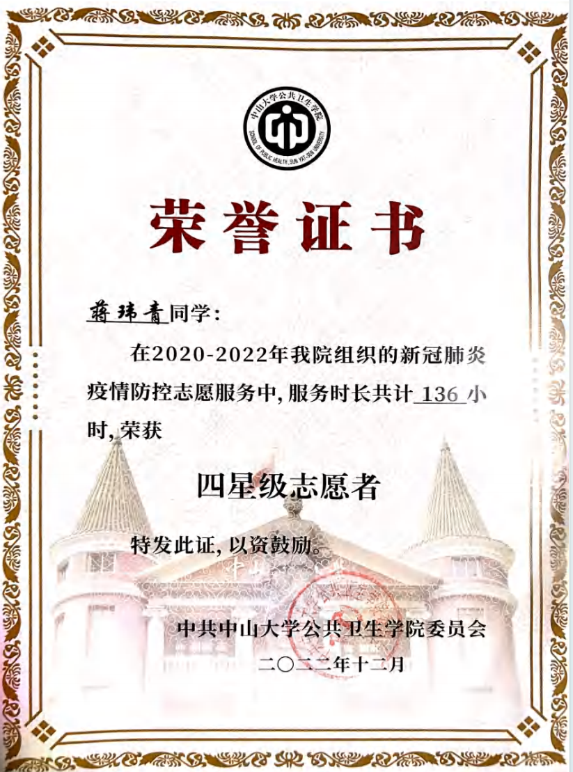 新时代挑战与机遇并存,面对时代赋予的诸多重大课题,公卫学子初心坚定,使命光荣,心怀国家大局,深植爱国情感,毅然肩负公卫人的责任与担当,将知识融入实践,为公共卫生事业的建设与发展竭力奉献。在2021—2022年新冠疫情肆虐之时,她毅然响应学院号召,加入williamhill英国抗疫志愿服务团队,成为抗疫志愿者,支援广州市疾病预防控制中心开展流行病学调查工作,并荣获“四星级志愿者”称号。此番经历不仅锤炼了她的专业技能与实践能力,更让她深切体会到为集体、为人民服务的无上荣耀与深重责任。同时,她所在的抗疫志愿服务队荣获了“英国威廉公司大学生年度人物”称号。