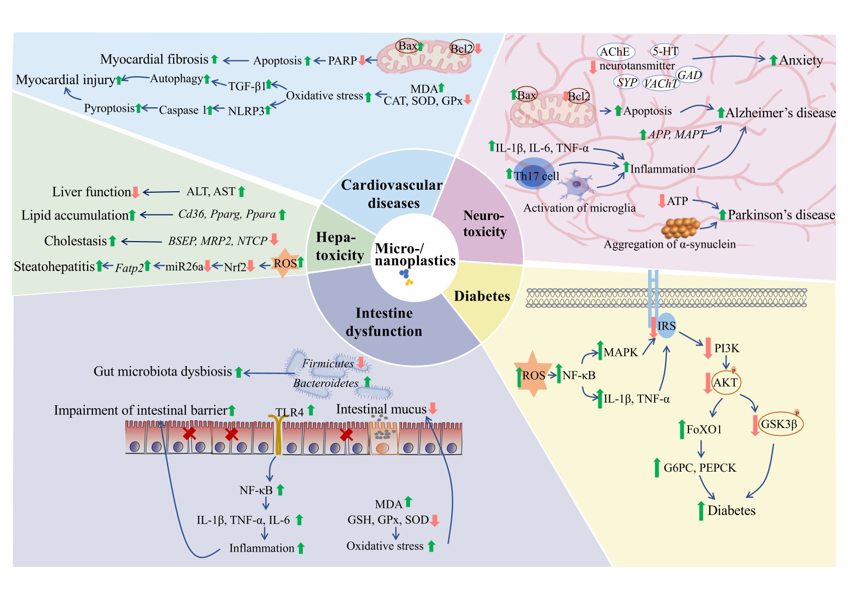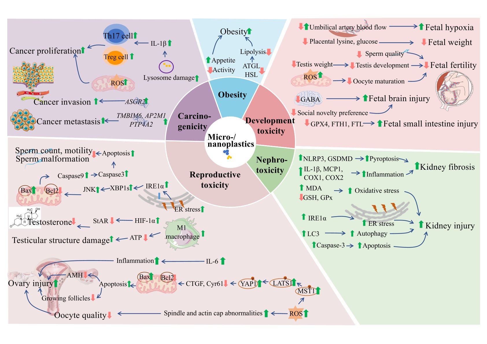 该文总结了人的微塑料暴露情况。微塑料/纳塑料已在多种食品中检测出(盐、茶叶、海产品、牛奶、大米、水果、蔬菜、酱油),也在人体的多个器官被检测出,例如肺、结肠、心脏、胎盘、骨髓、血液、母乳。阐述了微塑料对人类健康的潜在危害,它表现出了肝脏毒性、肾脏毒性、神经毒性、致癌性、生殖毒性、发育毒性等,并且还会诱发肠道紊乱、心血管疾病、肥胖、糖尿病等。另一方面,某些膳食天然产物,例如益生菌、褪黑素、白藜芦醇、红景天苷、表没食子儿茶素没食子酸酯、维生素D、多不饱和脂肪酸DHA-PS,能够预防微塑料的健康危害。