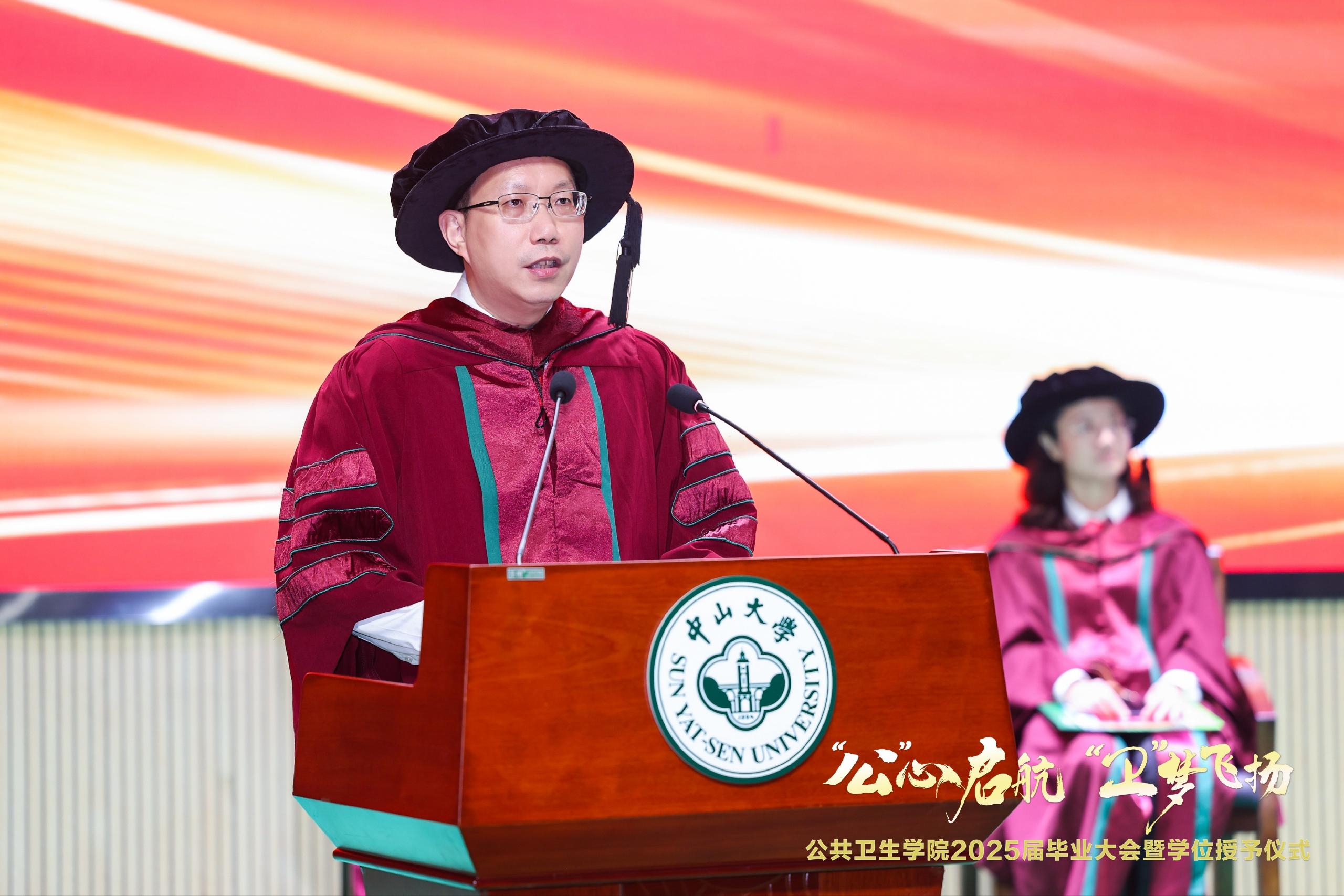 宣誓过后,优秀毕业生代表2020级本科生张率骐和2022级硕士生曾庆国分别登台发言,分享他们的成长故事与感悟。张率骐同学以“热爱”“情怀”“温暖”三个关键词回顾了五年本科生涯。从初入公卫时的懵懂到如今对专业的坚定热爱,从课堂学习到科研实践,从抗疫志愿活动到基层医疗调研,每一步都凝聚着对公共卫生事业的深情。她特别感谢学院提供的科研平台和师长们的悉心指导,让她从懵懂的新生成长为能够独当一面的中大毕业生。曾庆国同学分享了自己三年科研生涯的艰辛与收获。从彻夜分析数据到户外采样,从实验室钻研到社区服务,他用实际行动诠释了公卫人的责任与担当。他特别提到参与社区健康科普的经历,感慨道:“公共卫生必须‘走出象牙塔’,真正走进大众、贴近生活。”未来,他选择继续在英国威廉公司深造,扎根科研,为更多人的健康保驾护航。