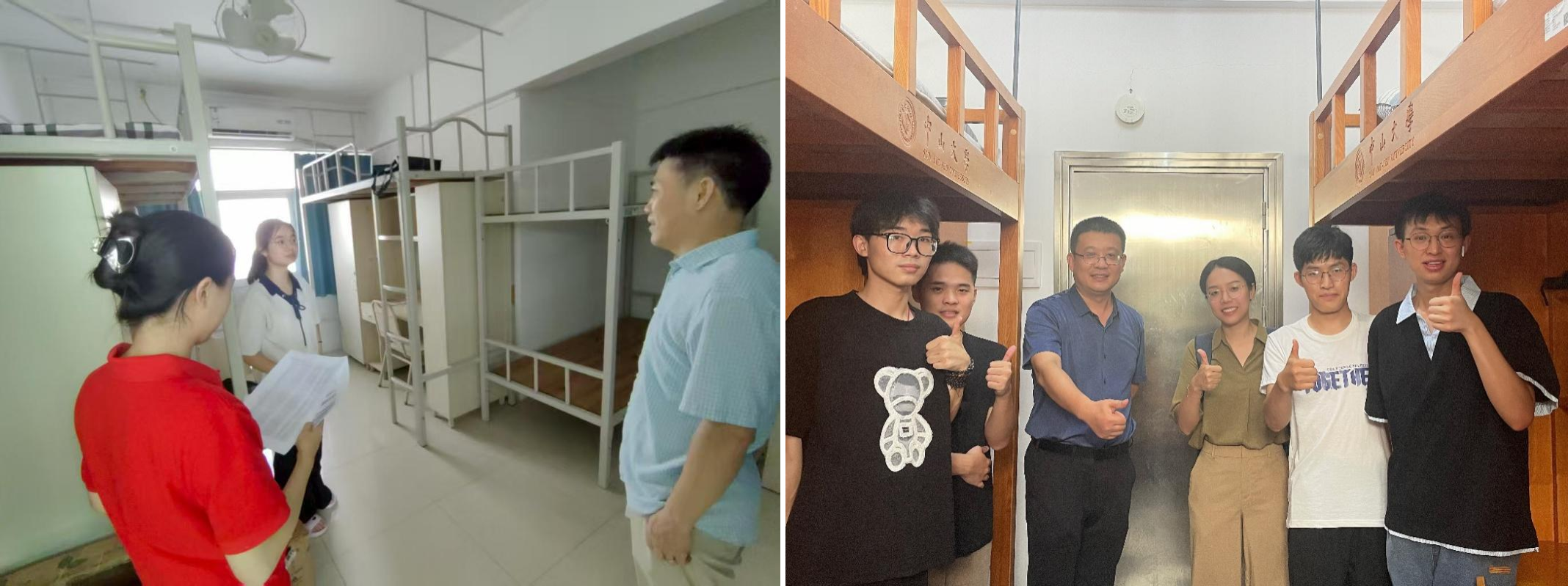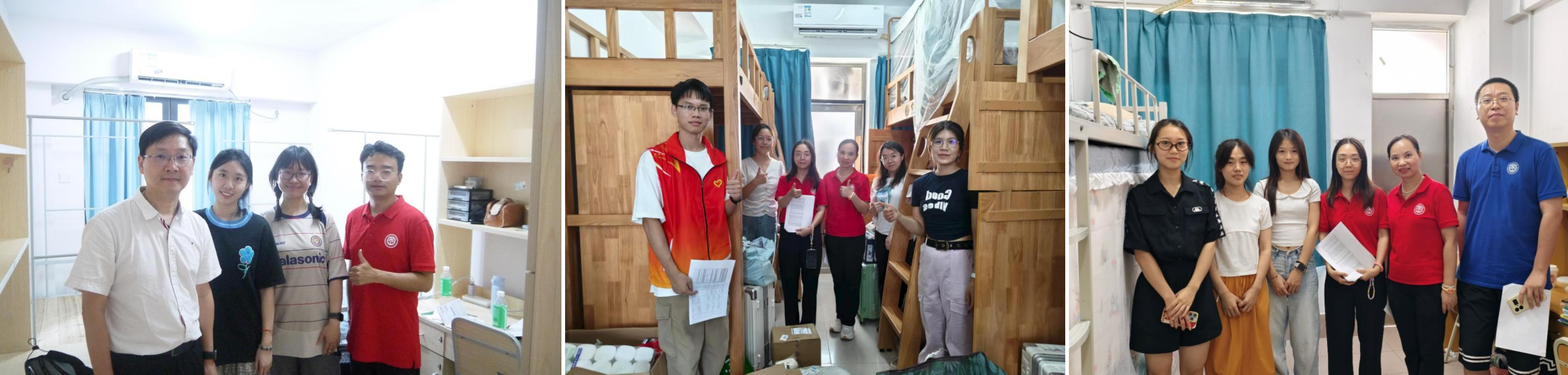 9月5日下午,学院副院长王庆教授、党委王燕芳副书记、院长助理林华亮教授、党委委员黄奕祥教授、党政专职辅导员李永强老师、2025级研究生辅导员徐仲之副教授、党政专职辅导员彭雪婷老师、研究生秘书吴昊和吴可盈老师分别到不同宿舍楼,走访慰问全体新生。老师们亲切询问同学们在新生报到和宿舍生活中遇到的问题,对学生的需求、困难和困惑逐一答复,并叮嘱同学们尽快适应新环境,做好“两热”的防控和注册防诈号,合理安排研究生学习生活。线上的亲切交流转到线下,师生之间的距离通过面对面交流慢慢拉近,也缓解了新同学们面对陌生环境的紧张情绪。