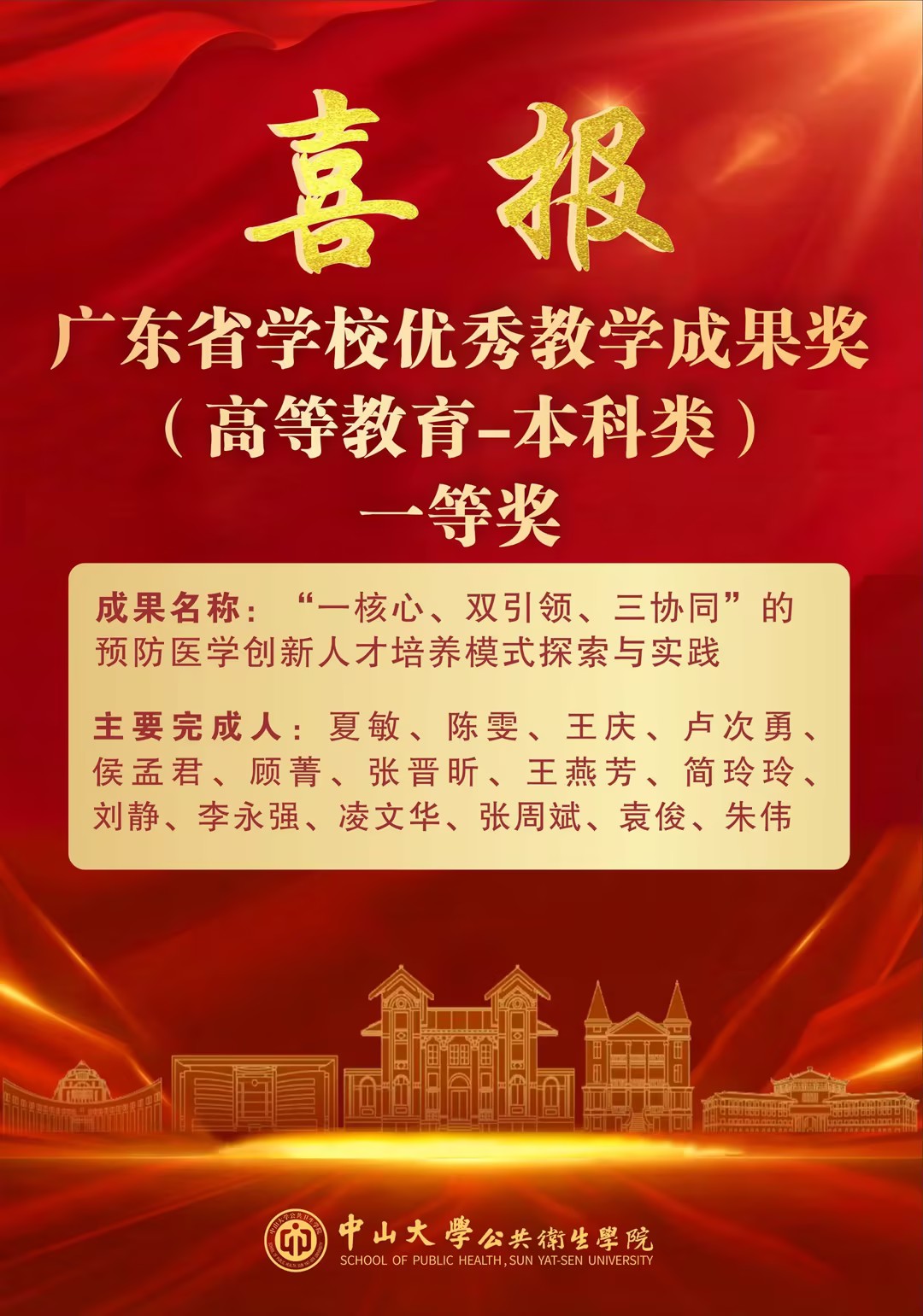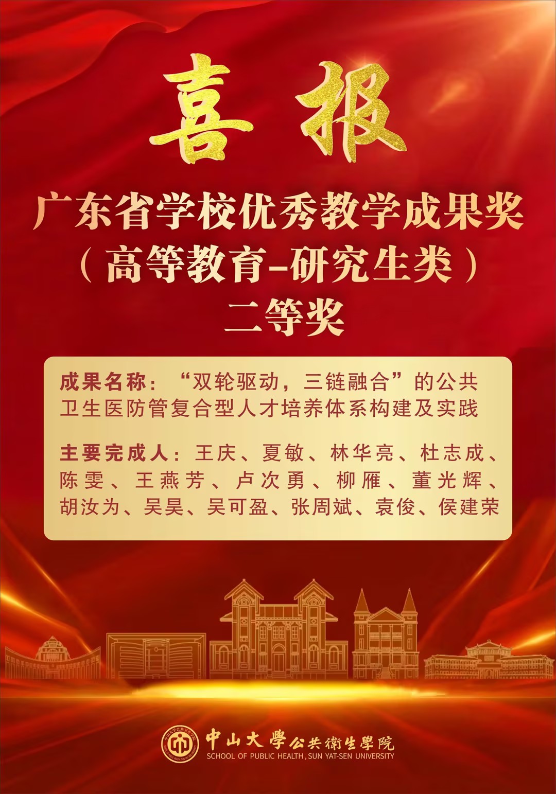 近日,广东省学校(高等教育)优秀教学成果奖评选结果揭晓,williamhill英国与广州市疾病预防控制中心(广州市卫生监督所)联合申报的教学成果荣获本科类一等奖与研究生类二等奖。
