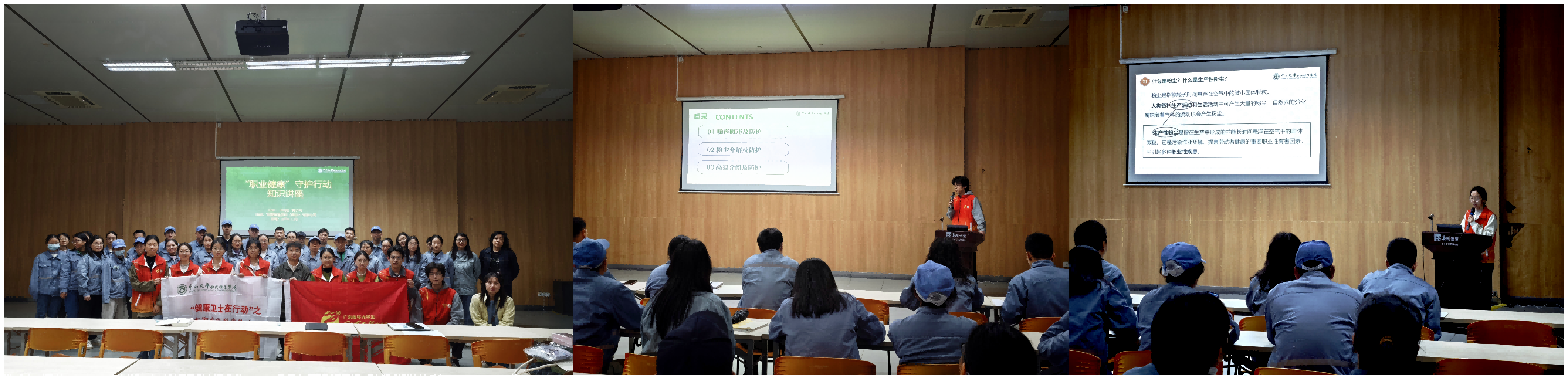 揭牌仪式圆满落幕之后,实践团来到华润怡宝饮料(南宁)有限公司,开展了第一场活动——职业健康科普讲座。期间,黄子龙用通俗的语言解读了噪声“3dB交换律”、中暑表现及防护等专业知识,还贴心为每位工人分发了防护耳塞,一步步拆解佩戴要领,逐一指导纠正,开展手把手教学。卫怡廷则聚焦生产性粉尘防护,实操指导工人正确佩戴防尘口罩,筑牢粉尘防护防线。这场科普活动,把职业健康防护送到一线,让工人听得懂、学得会、用得上,为职场健康筑牢安全屏障,赢得现场一致好评。
