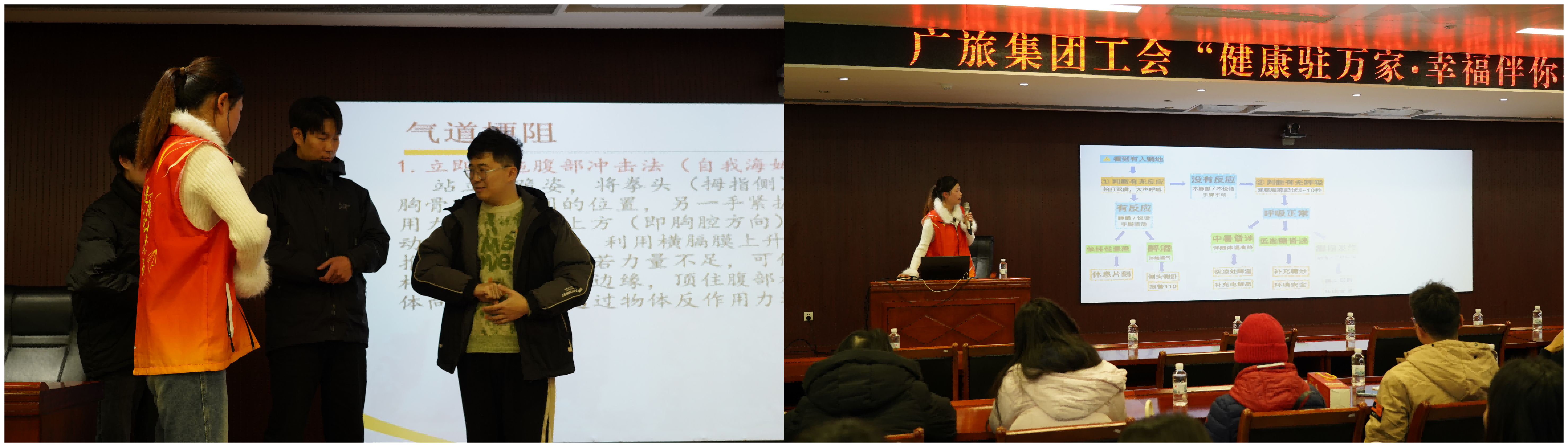 1月21日下午,实践团走进广西旅游发展集团,开展“急救在身边”主题讲座。主讲人王艺玮、陈雅晴聚焦职场常见意外,生动讲解了流鼻血、低血糖、烧烫伤、心肺复苏等应急处理知识。讲座注重实操互动,在讲解气道梗阻急救时,邀请员工上台演练“海姆立克法”,手把手纠正动作;模拟电梯故障场景中,指导员工学习应急避险姿势。现场互动热烈,员工在实操中真正掌握了急救技能。活动将专业知识转化为实用职场技能,切实提升了企业员工的应急自救能力,为职场安全筑牢了防线。